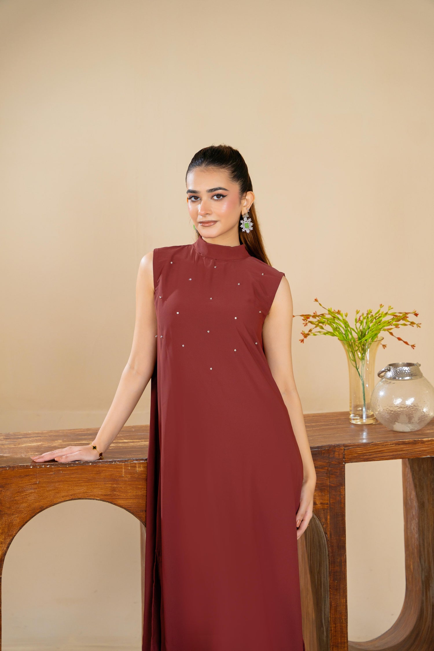 Brick red georgette shirt, sleeveless and flowy with stone embellishments and back-tie detail.
