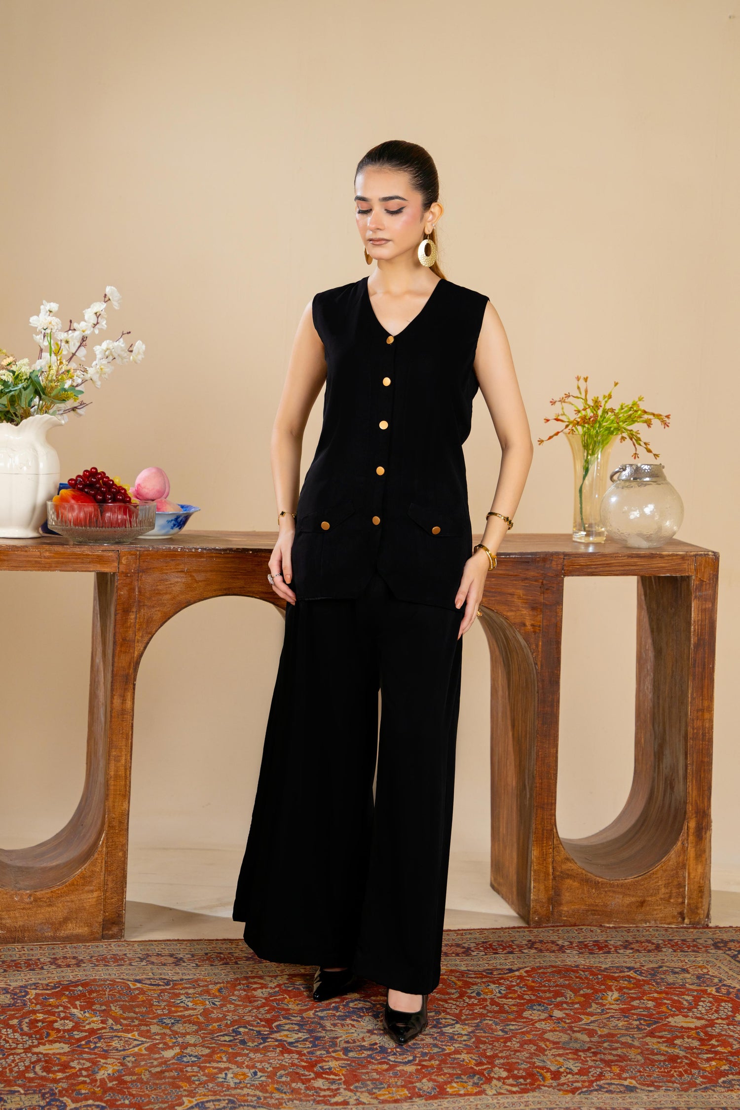 Sleek black sleeveless vest with gold buttons, styled with wide-leg matching trousers.