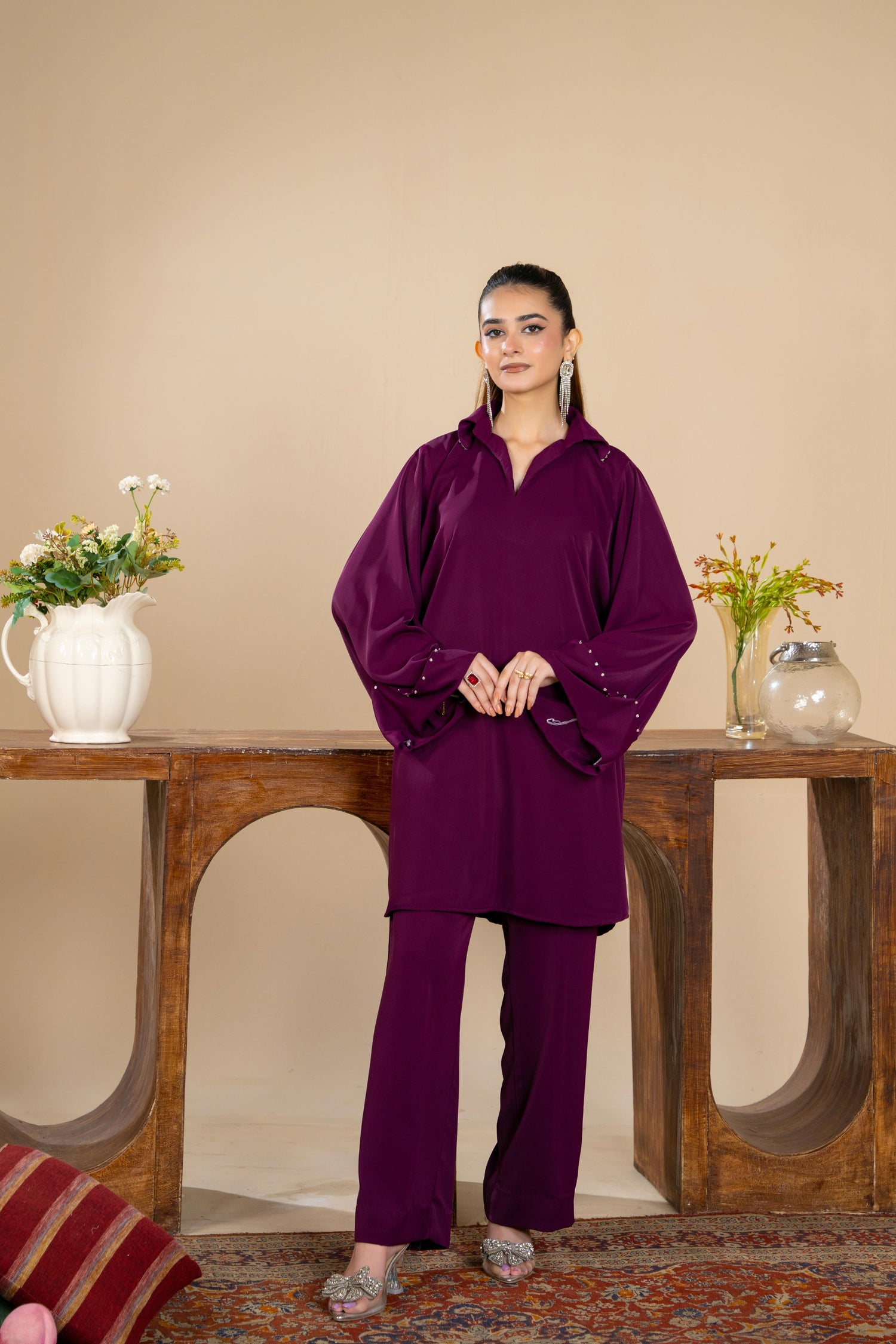Rich plum co-ord set with crystal-detailed collar, stone-embellished sleeves, and matching pants.