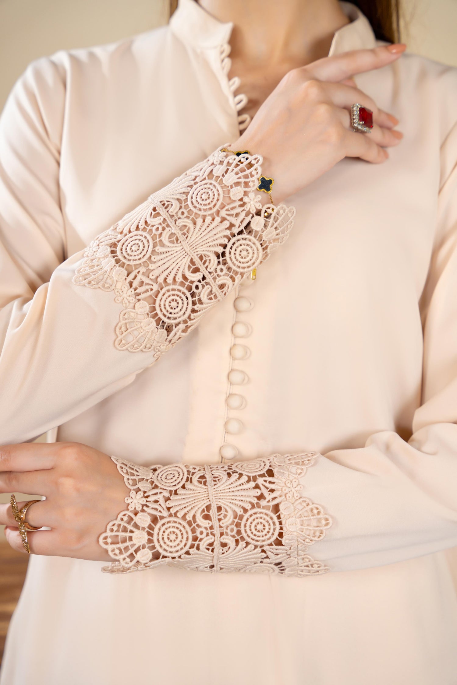 Chic cream long shirt with lace cuffs and I-button neckline, paired with matching trousers.