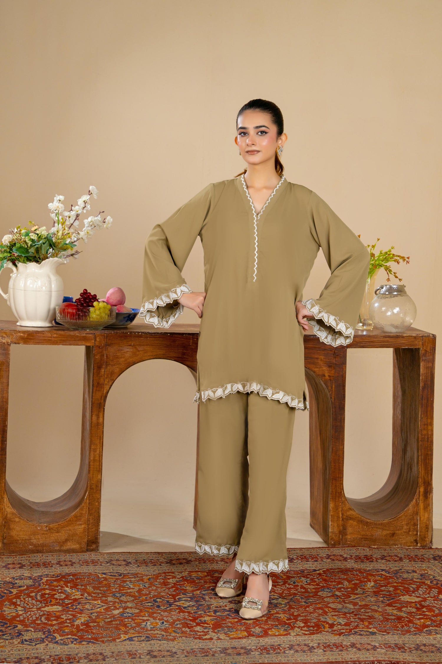 Olive green georgette outfit with delicate white embroidery and modern stitching accents.