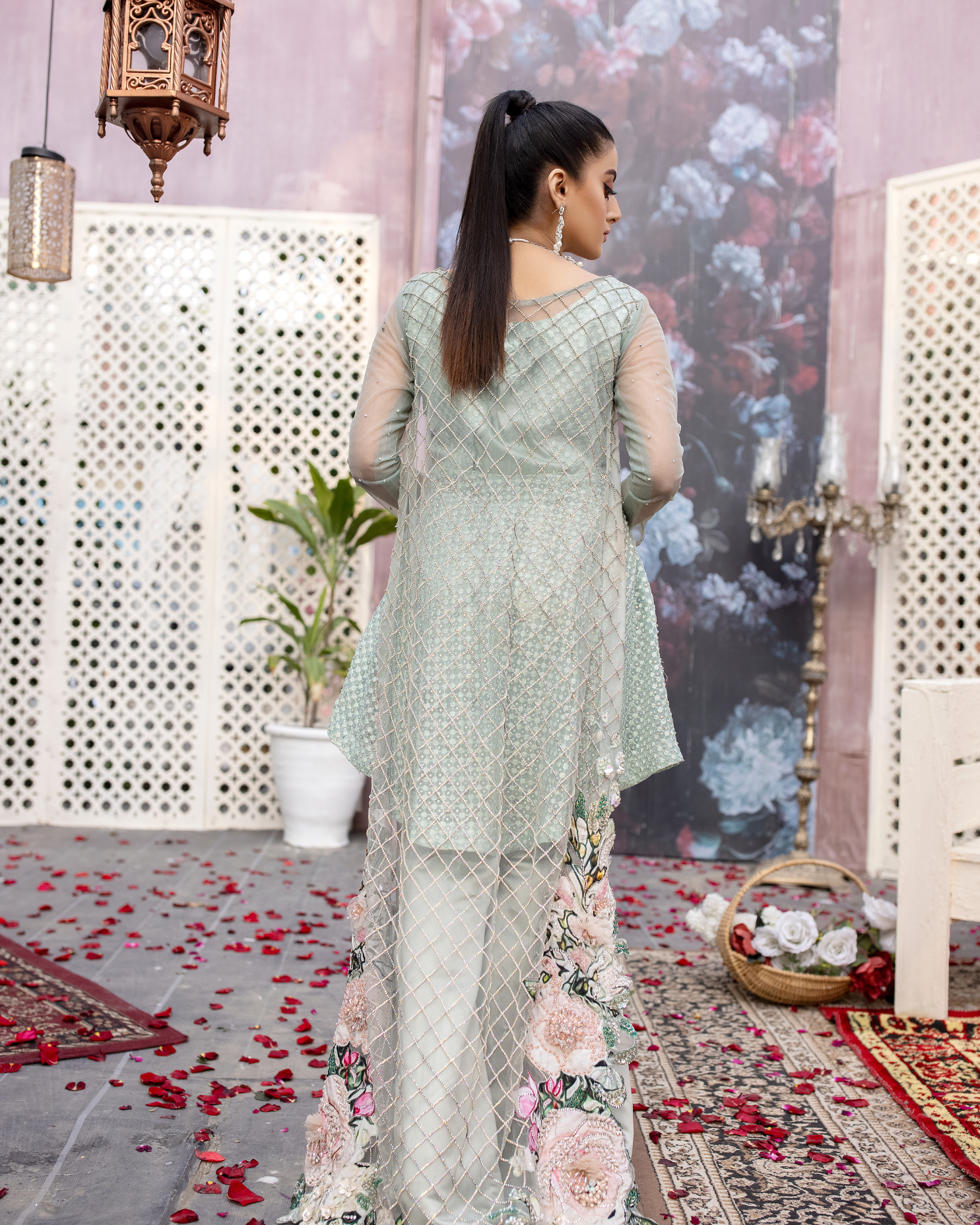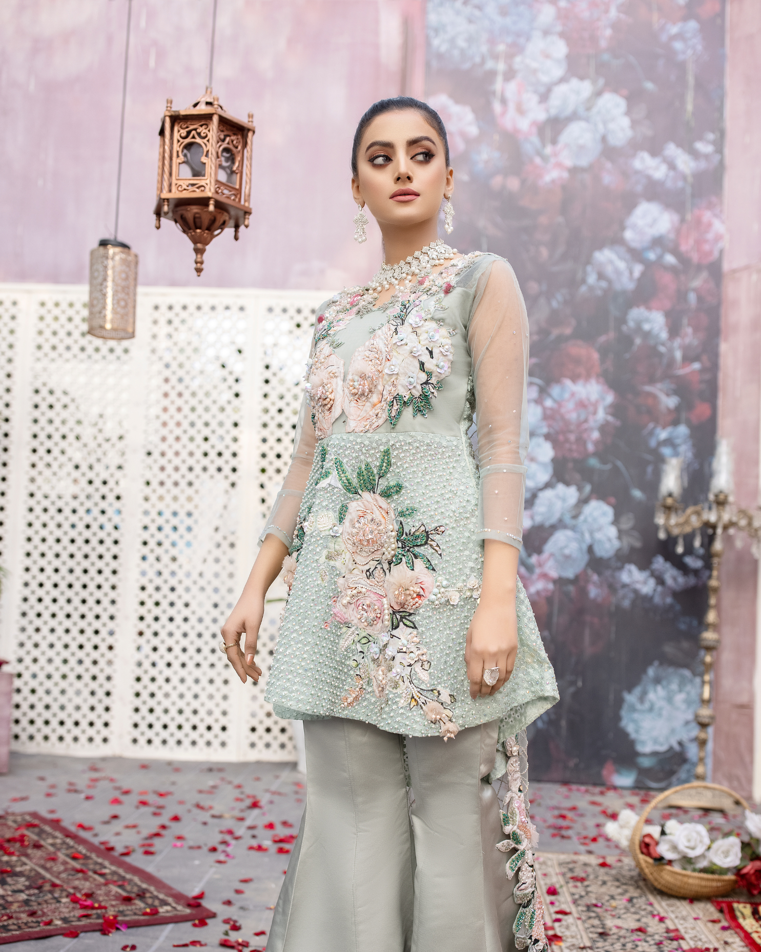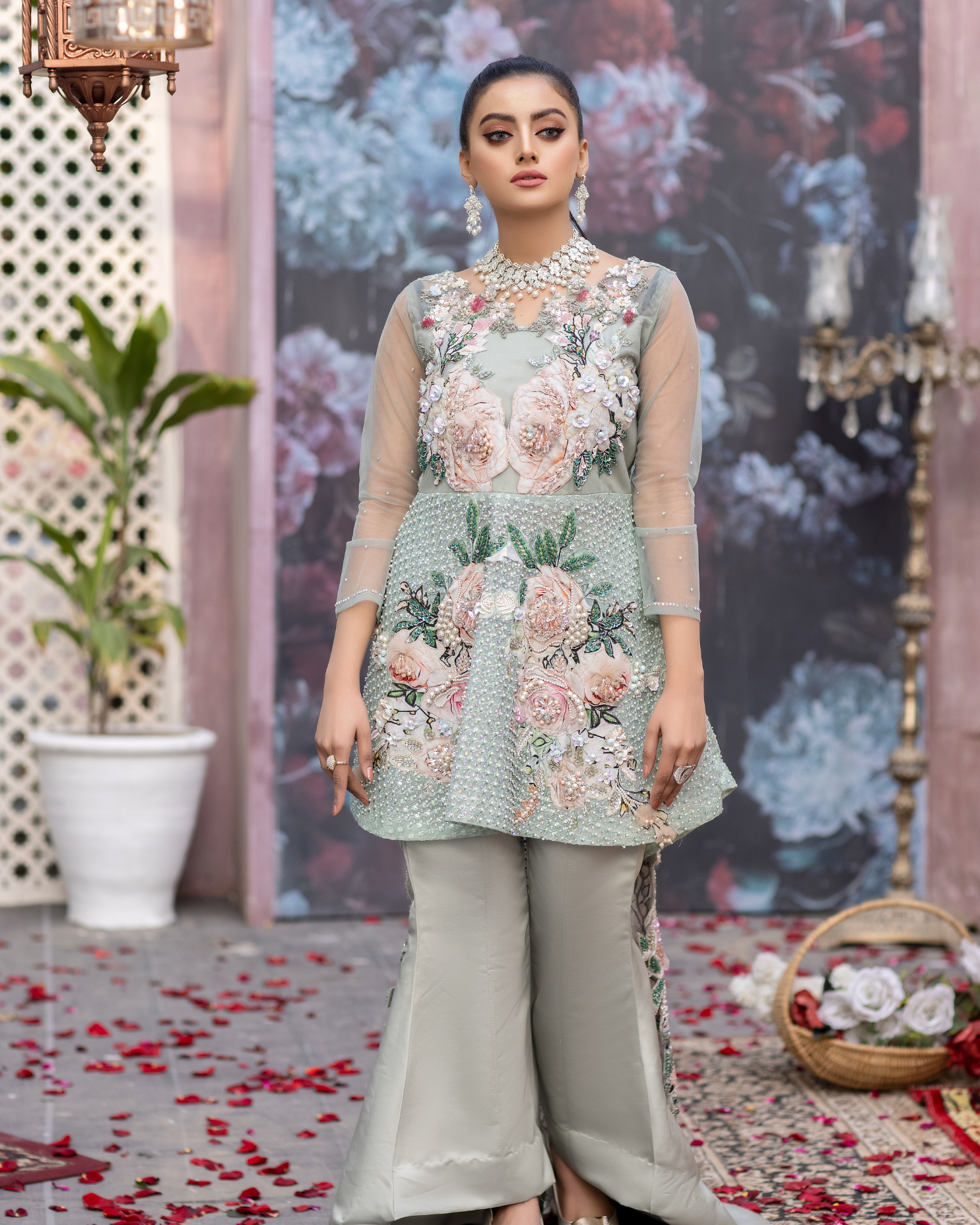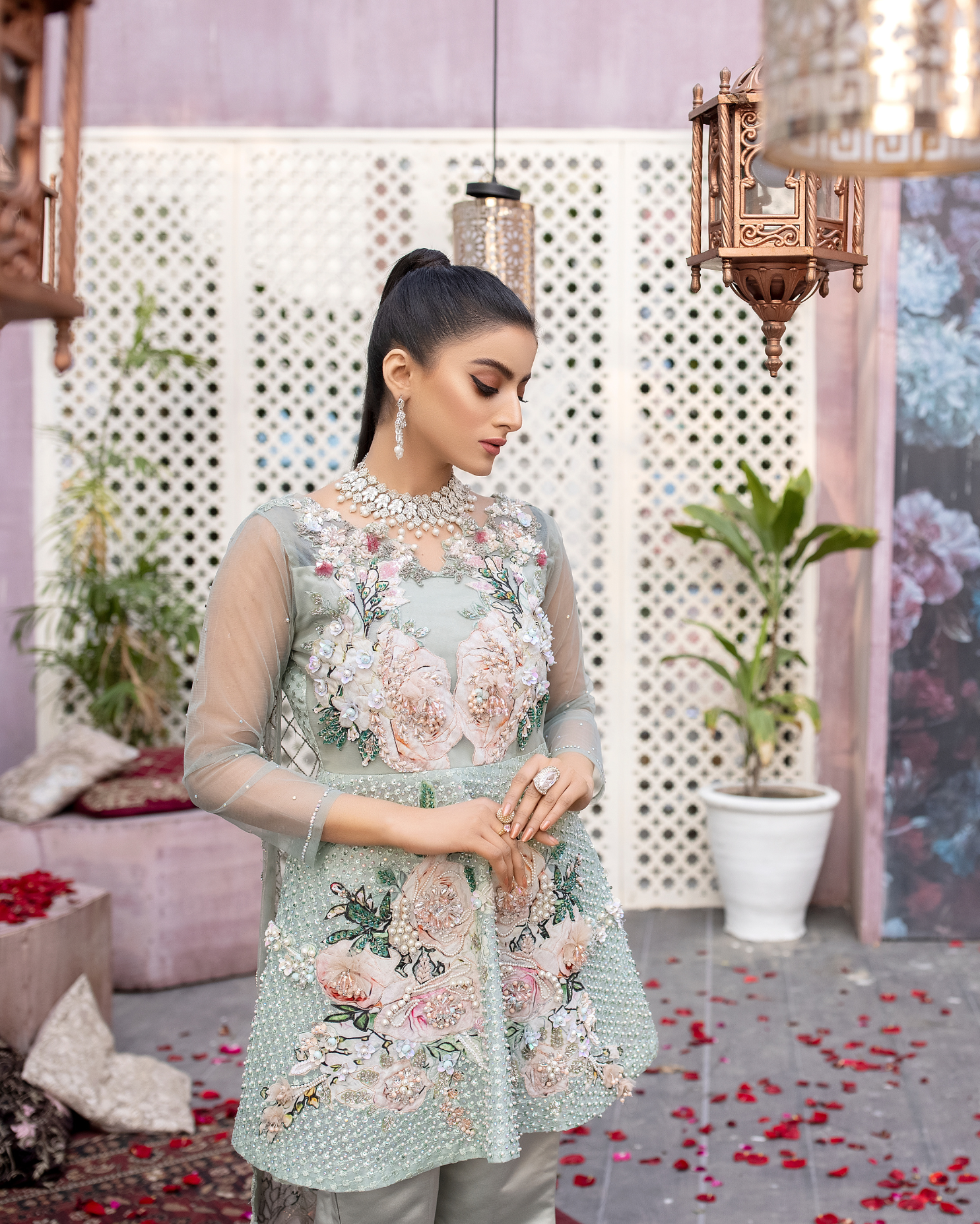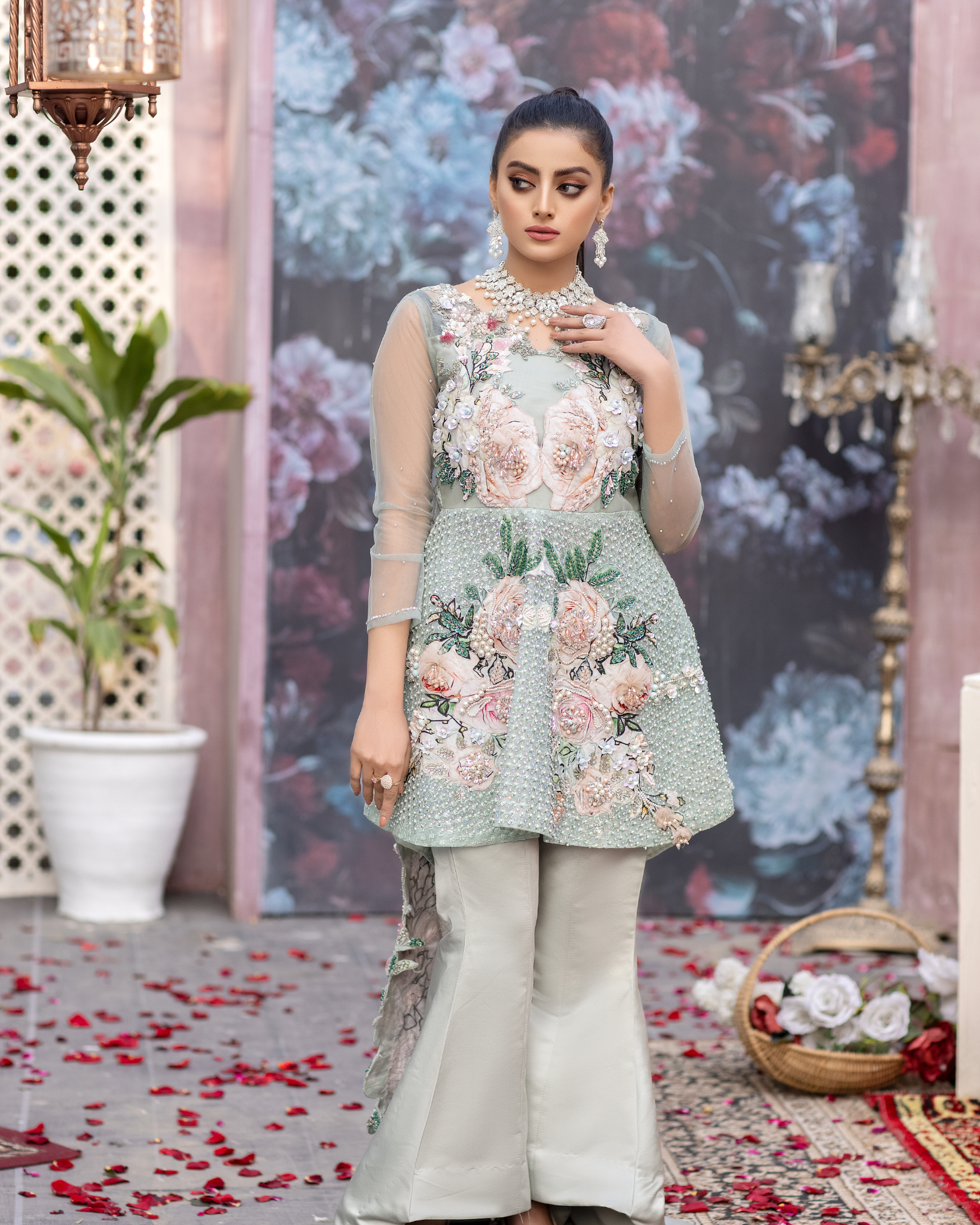 This exquisite peplum shirt style is a true masterpiece, featuring a graceful tail cape that flows effortlessly. The intricate net sleeves, adorned with applique, Swarovski stones, crystals, pearls, and diamantes, elevate the design, while the delicate sequence and r embroidery add a layer of timeless elegance. 💎 A perfect blend of luxury and sophistication, this look is a celebration of artistry and style. Shop the Aqua Blossom collection now and experience the magic for yourself!
