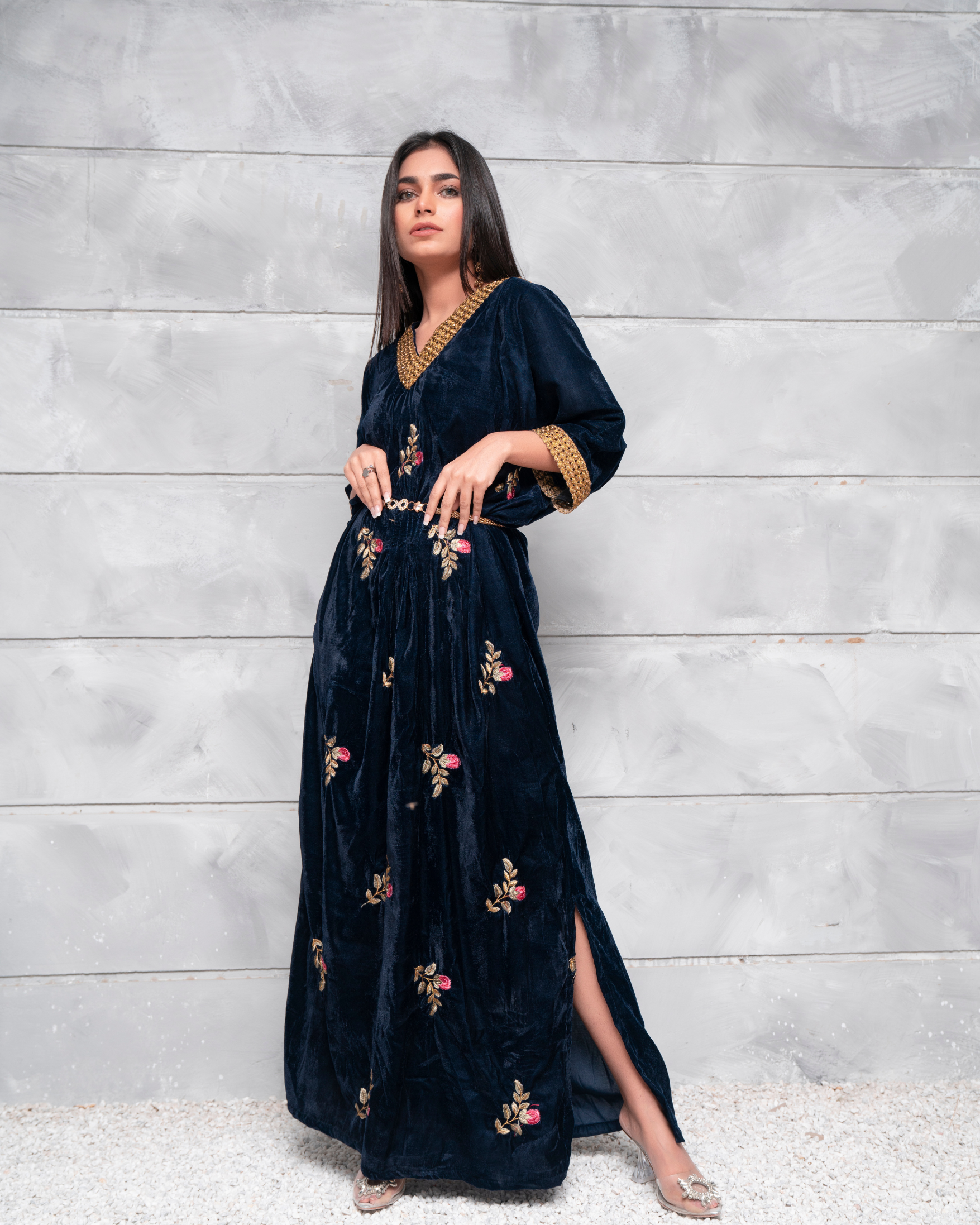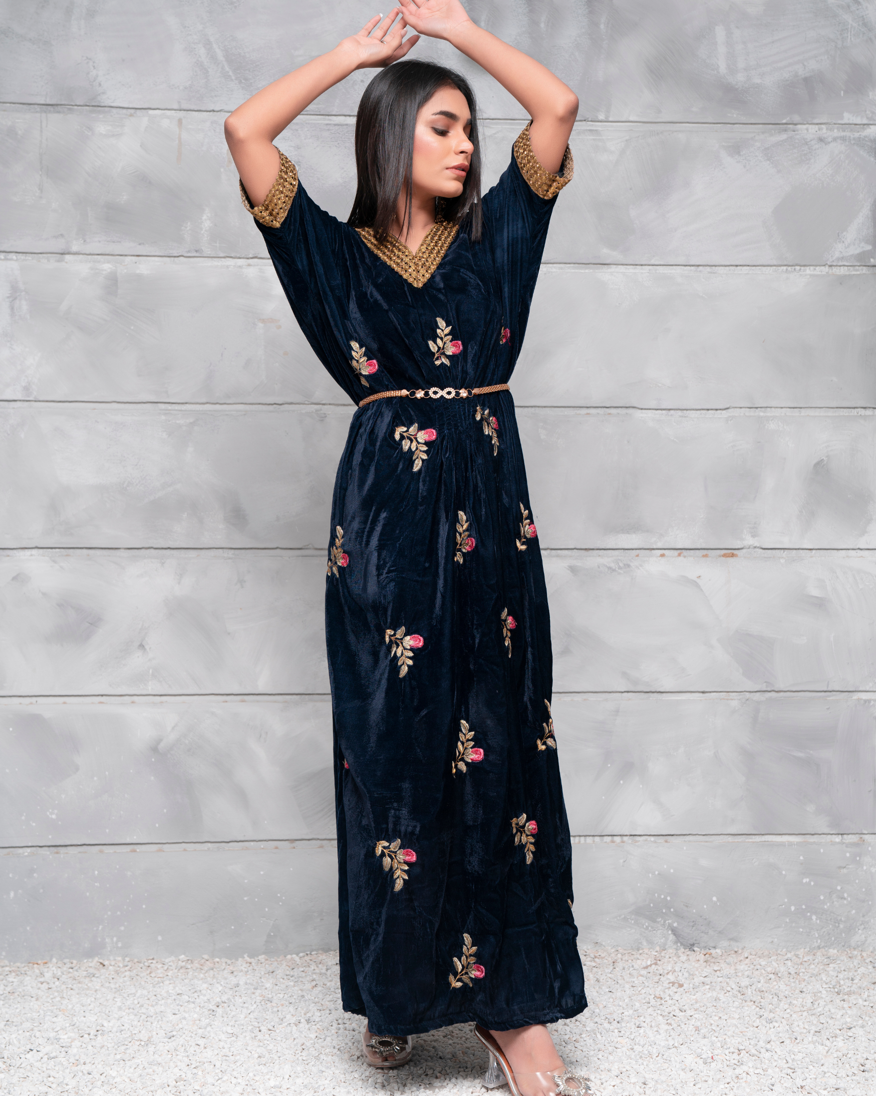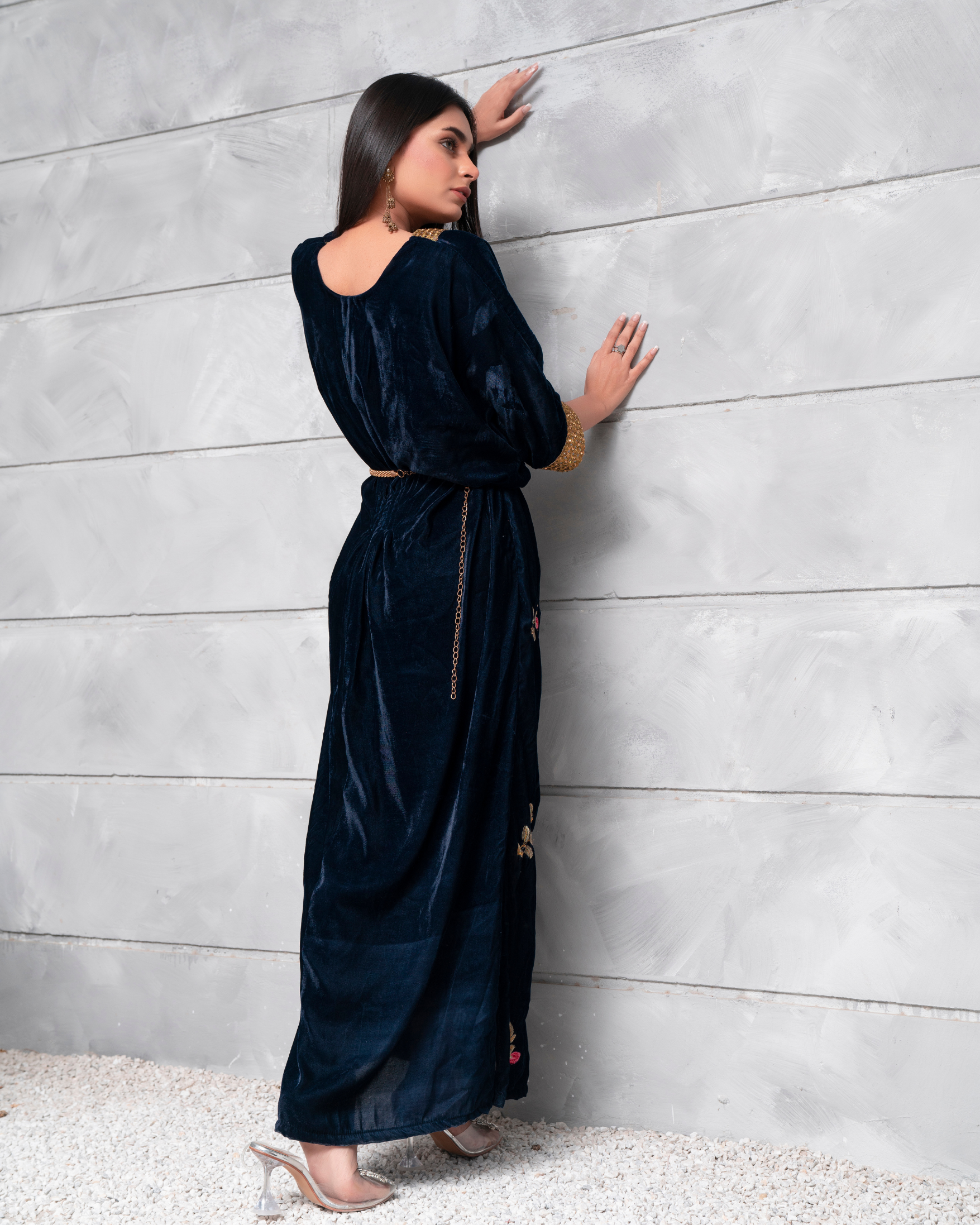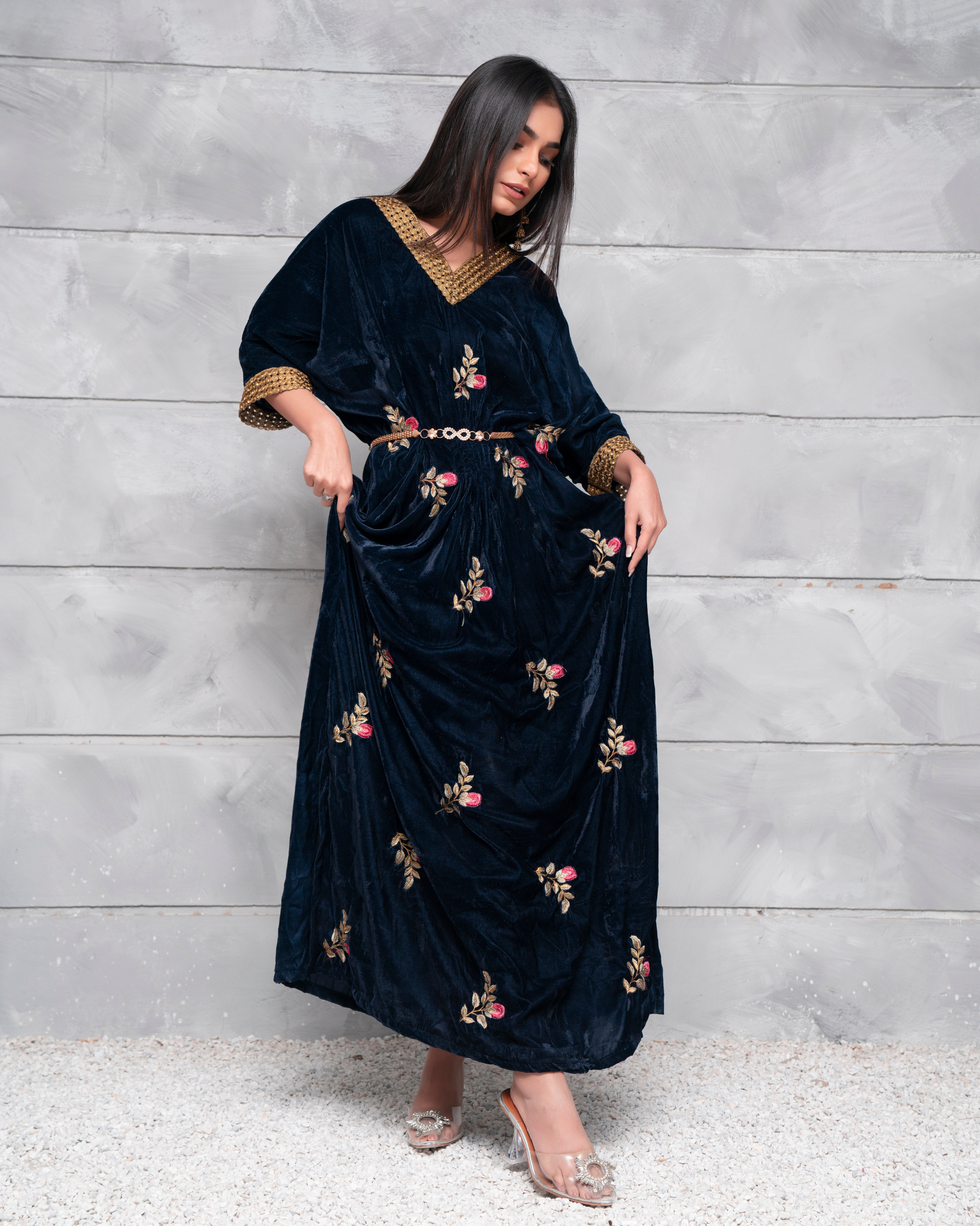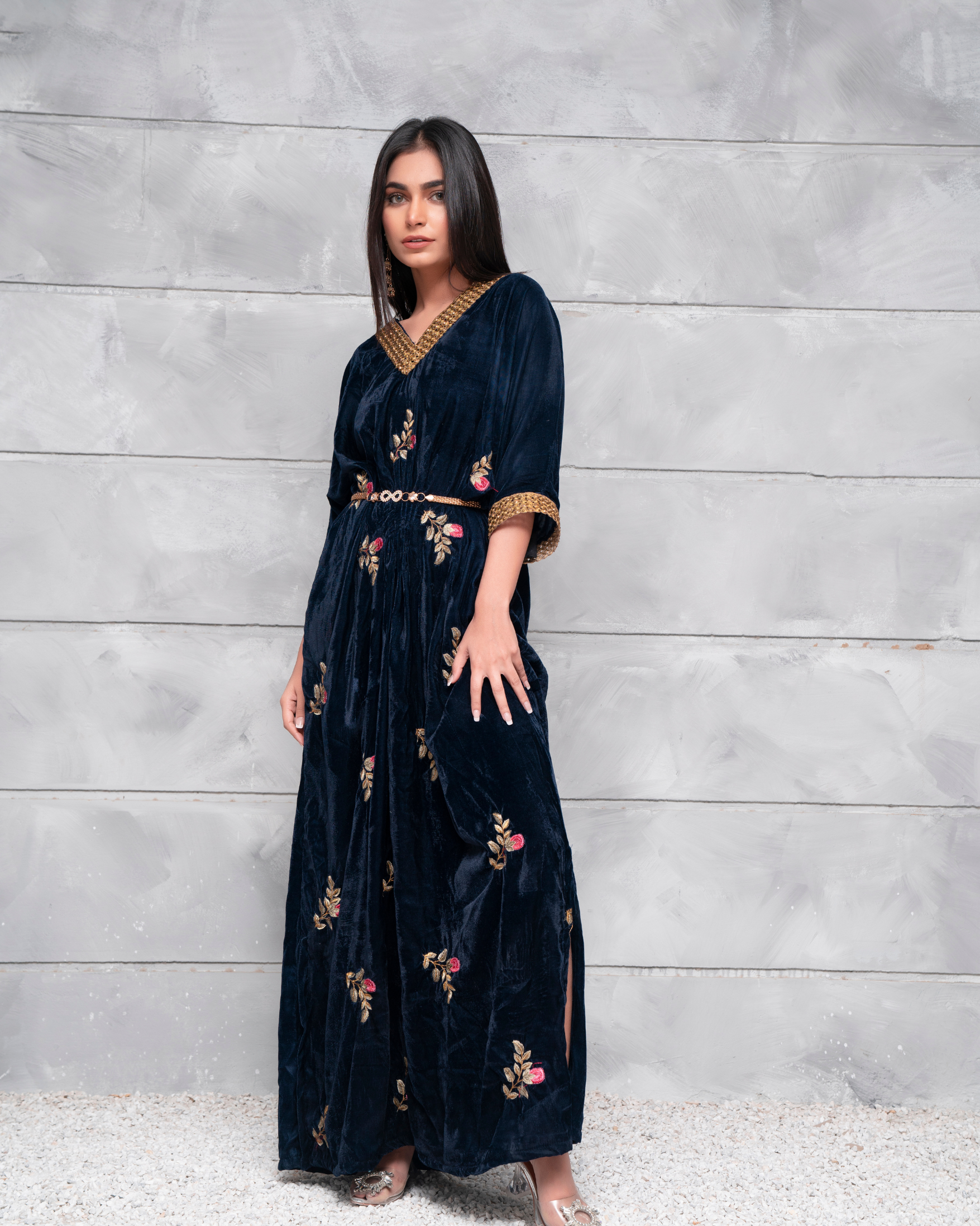 Embodying an aura of subtle grace, Velsia features an impeccable kaftan dress rendered in a deep blue tone on velvety base, perfectly complimenting this iridescent attire.