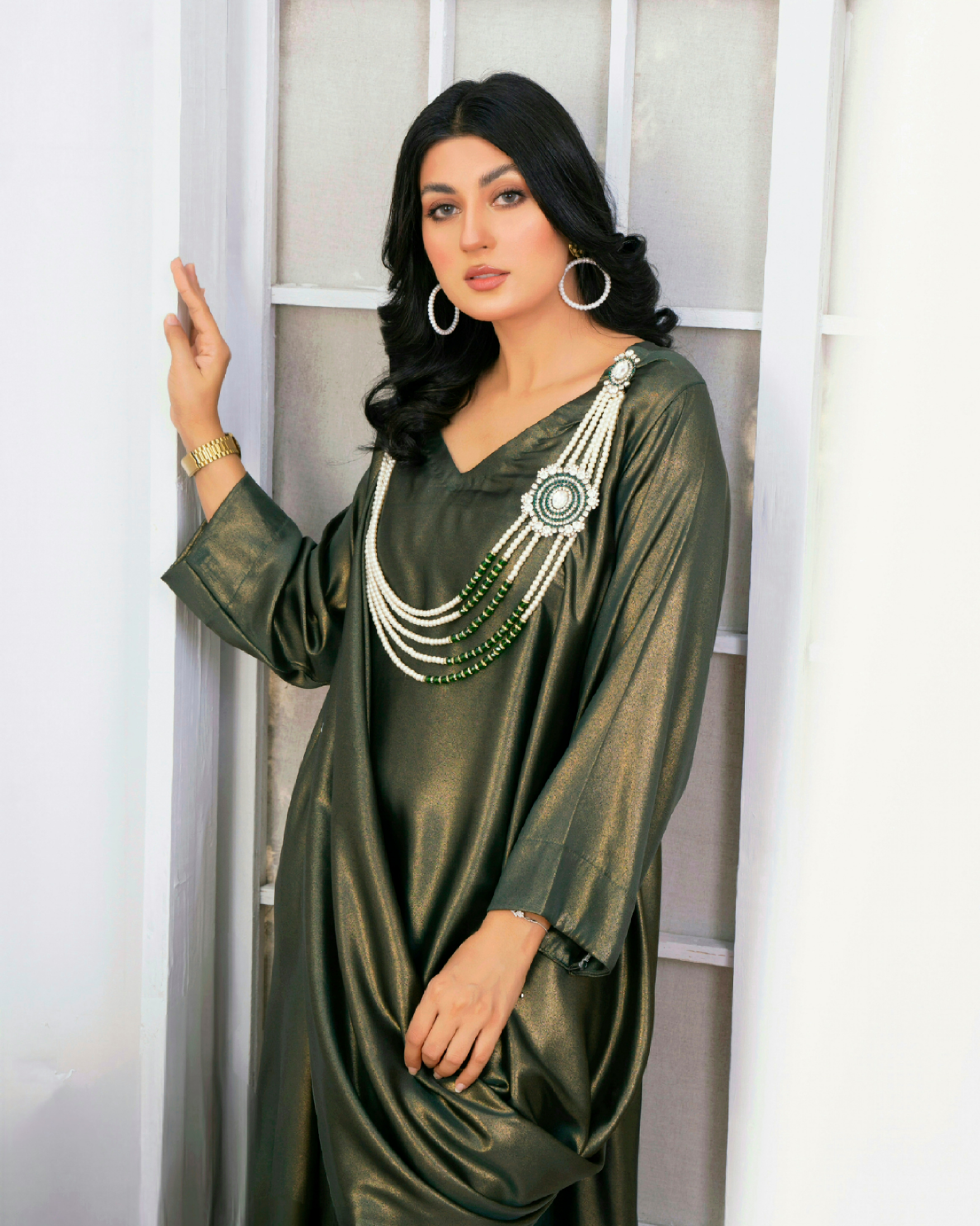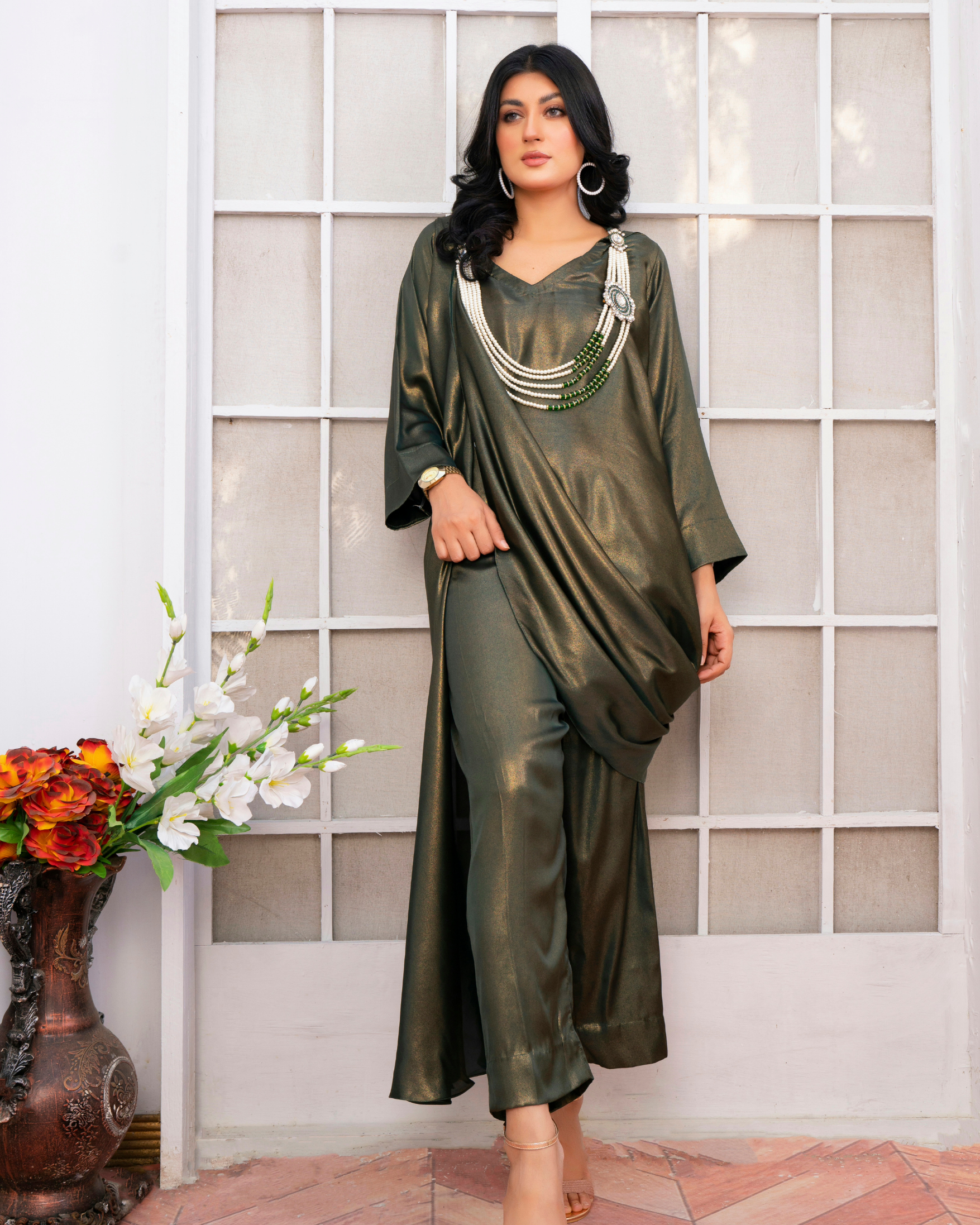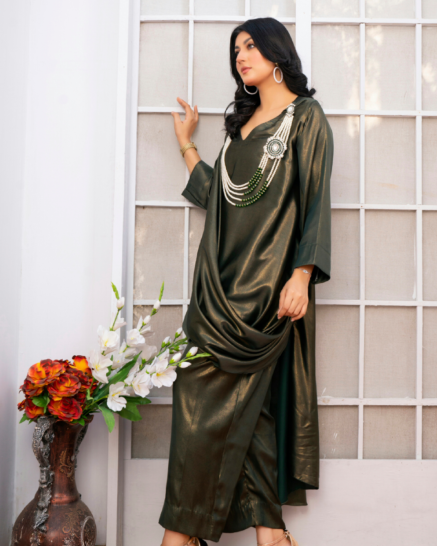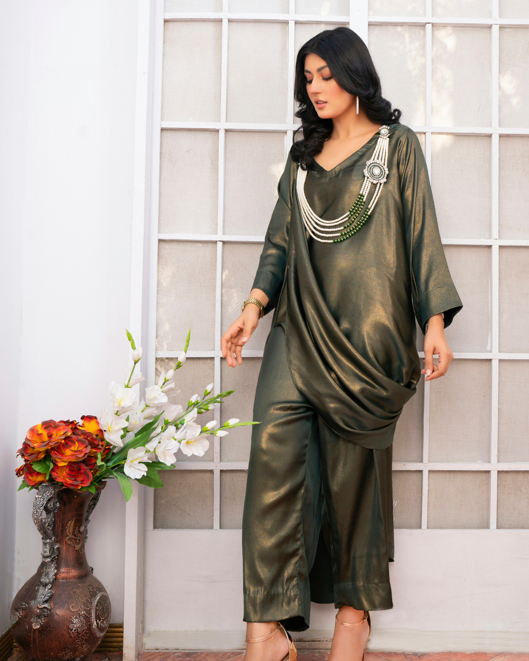 Sea gold features an impeccable silhouette enhanced on a canvas of pickle green, artistically stitched with a one-sided ruffle fall, giving a whole look a whimsical vibe ✨