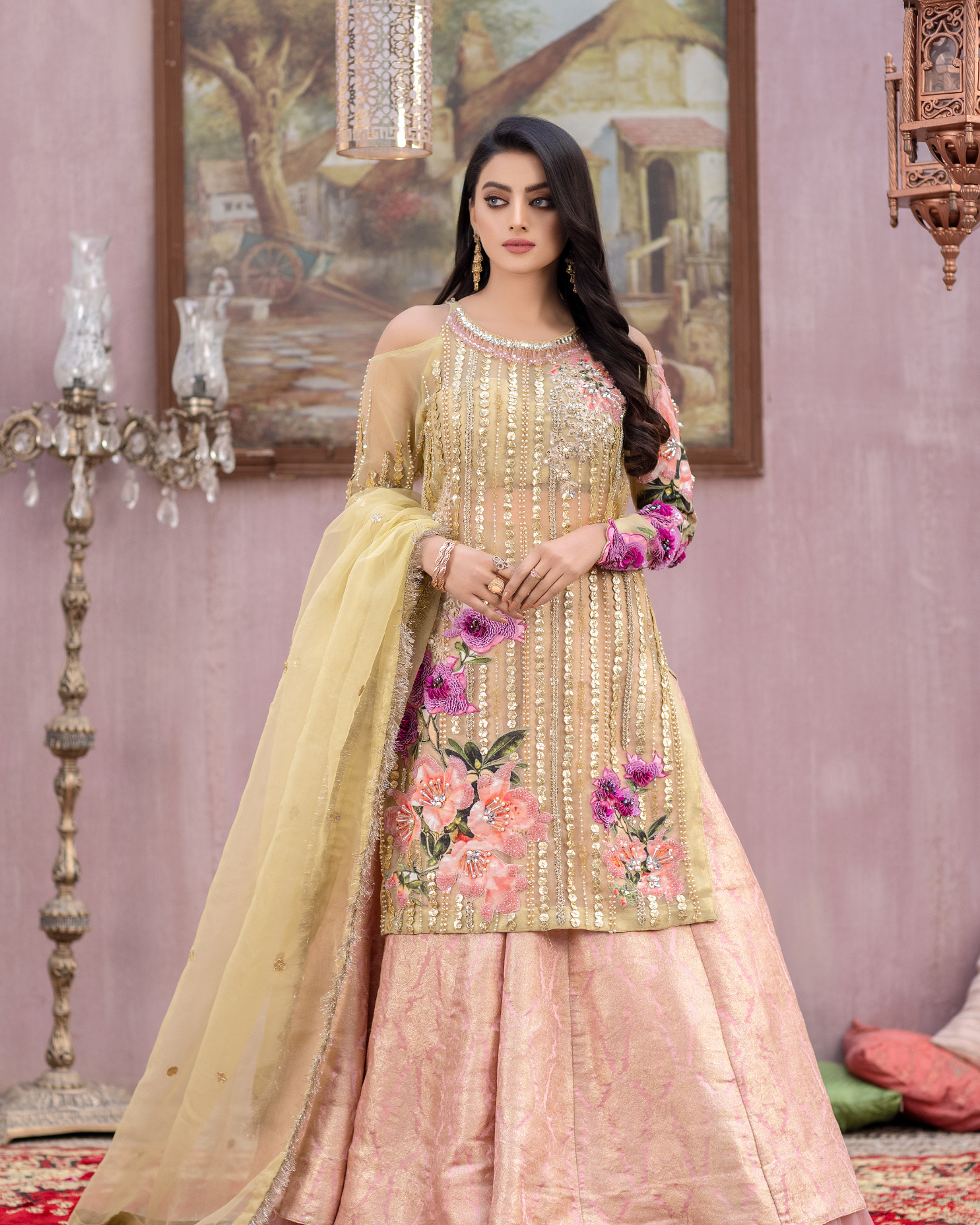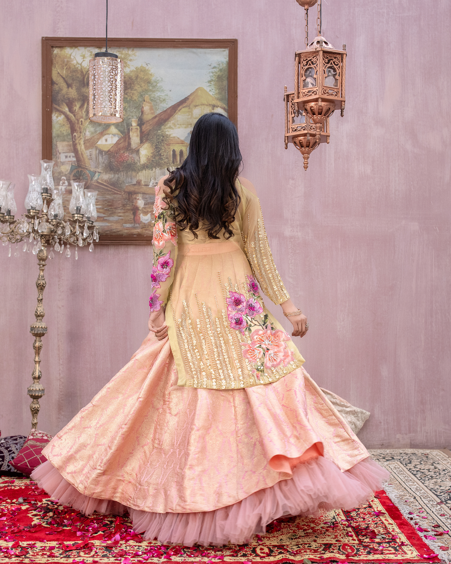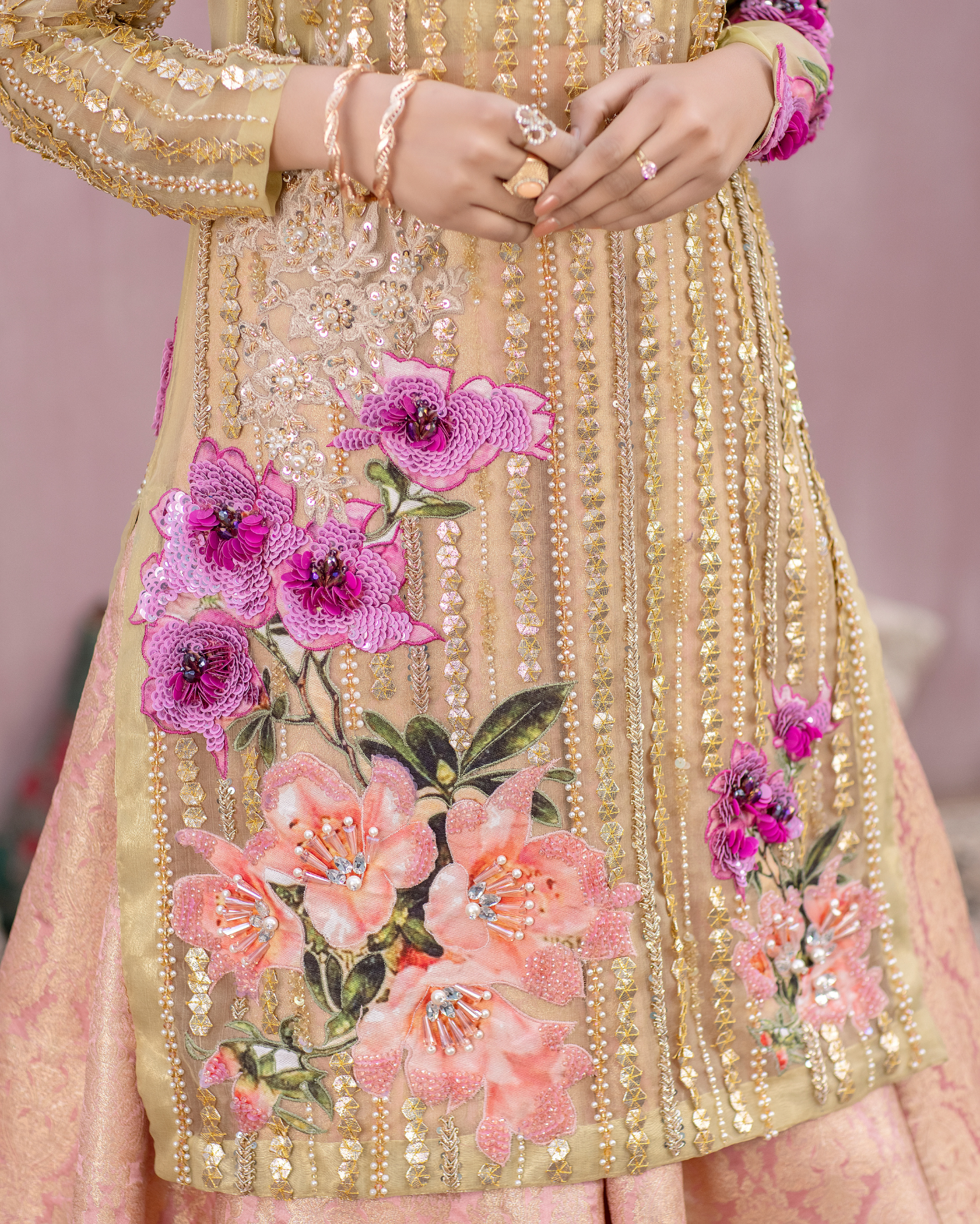 Introducing Introducing Golden Flamingo a true celebration of opulence and craftsmanship. This extravagant ensemble features a stunning Lehenga over a luxurious Korean Silk inner, perfectly complemented by a golden Organza shirt. The hand-embellished details, featuring intricate, crystals, and pearls, add a dazzling touch to the design. Masterfully woven with kora sequence and hand-embroidered applique work, this piece is a masterpiece that exudes timeless luxury. a true celebration of opulence and craftsmanship. This extravagant ensemble features a stunning Lehenga over a luxurious Korean Silk inner, perfectly complemented by a golden Organza shirt. The hand-embellished details, featuring intricate , crystals, and pearls, add a dazzling touch to the design. Masterfully woven with kora sequence and hand-embroidered applique work, this piece is a masterpiece that exudes timeless luxury.