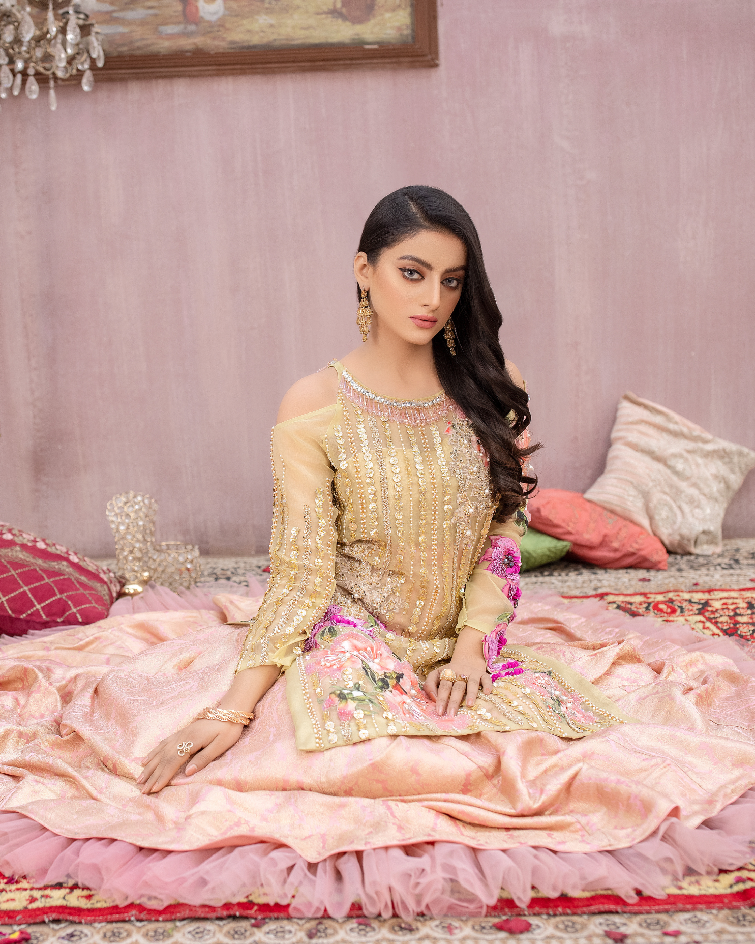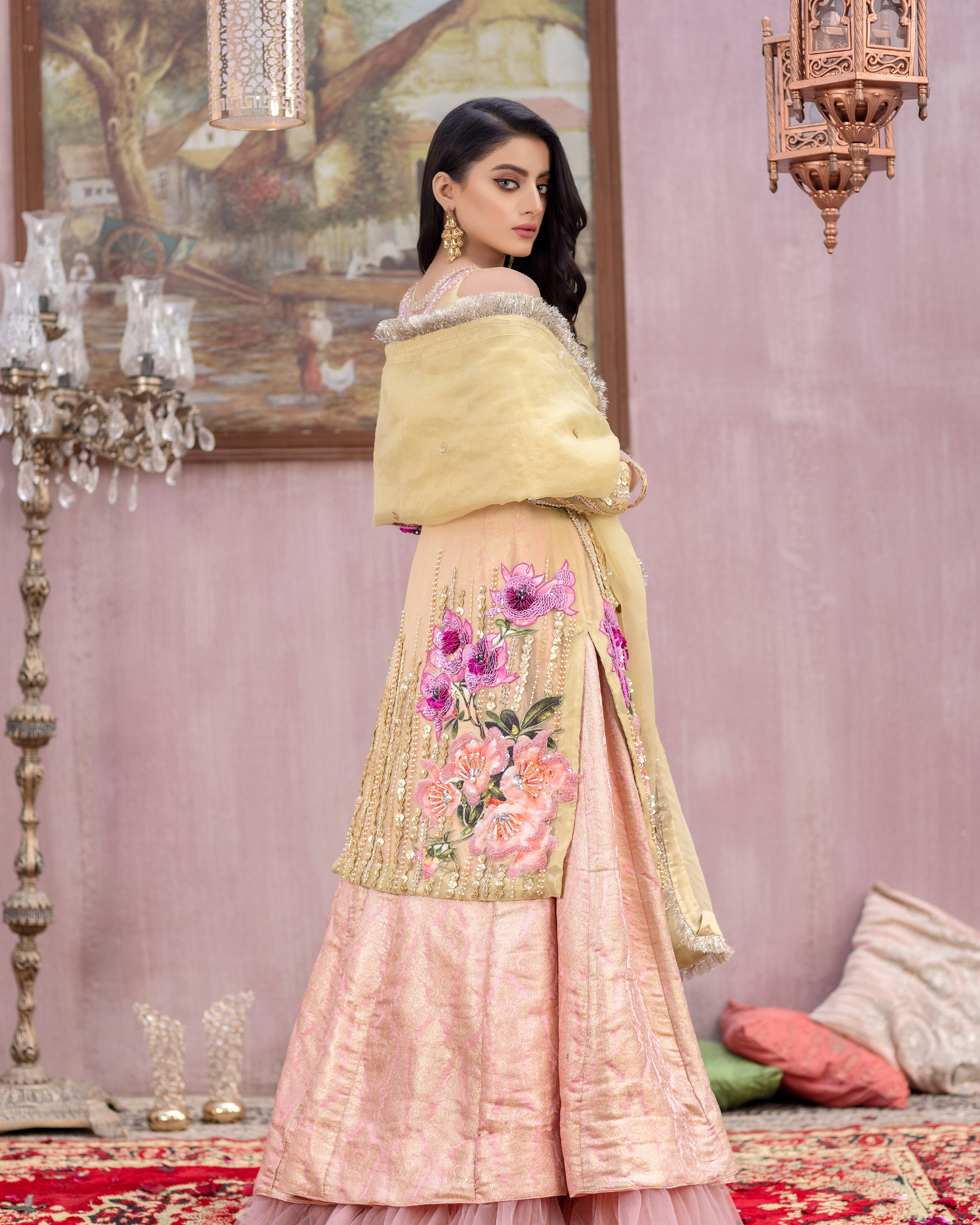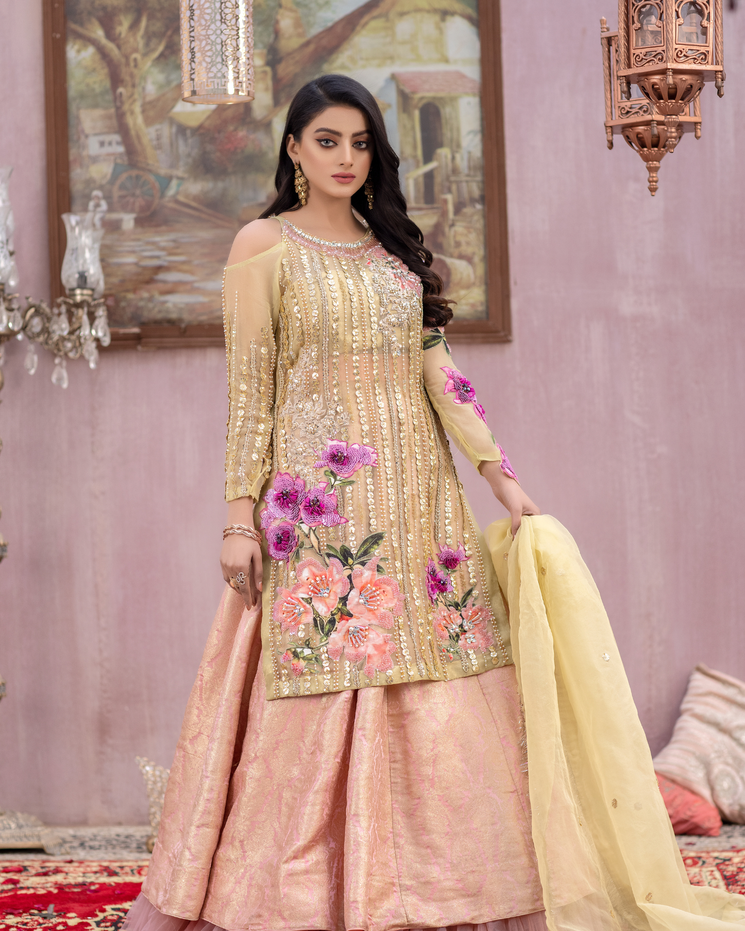 Introducing Introducing Golden Flamingo a true celebration of opulence and craftsmanship. This extravagant ensemble features a stunning Lehenga over a luxurious Korean Silk inner, perfectly complemented by a golden Organza shirt. The hand-embellished details, featuring intricate, crystals, and pearls, add a dazzling touch to the design. Masterfully woven with kora sequence and hand-embroidered applique work, this piece is a masterpiece that exudes timeless luxury. a true celebration of opulence and craftsmanship. This extravagant ensemble features a stunning Lehenga over a luxurious Korean Silk inner, perfectly complemented by a golden Organza shirt. The hand-embellished details, featuring intricate , crystals, and pearls, add a dazzling touch to the design. Masterfully woven with kora sequence and hand-embroidered applique work, this piece is a masterpiece that exudes timeless luxury.
