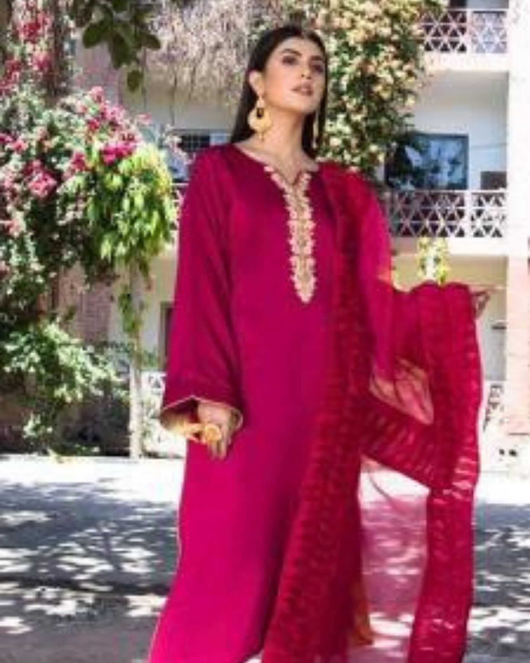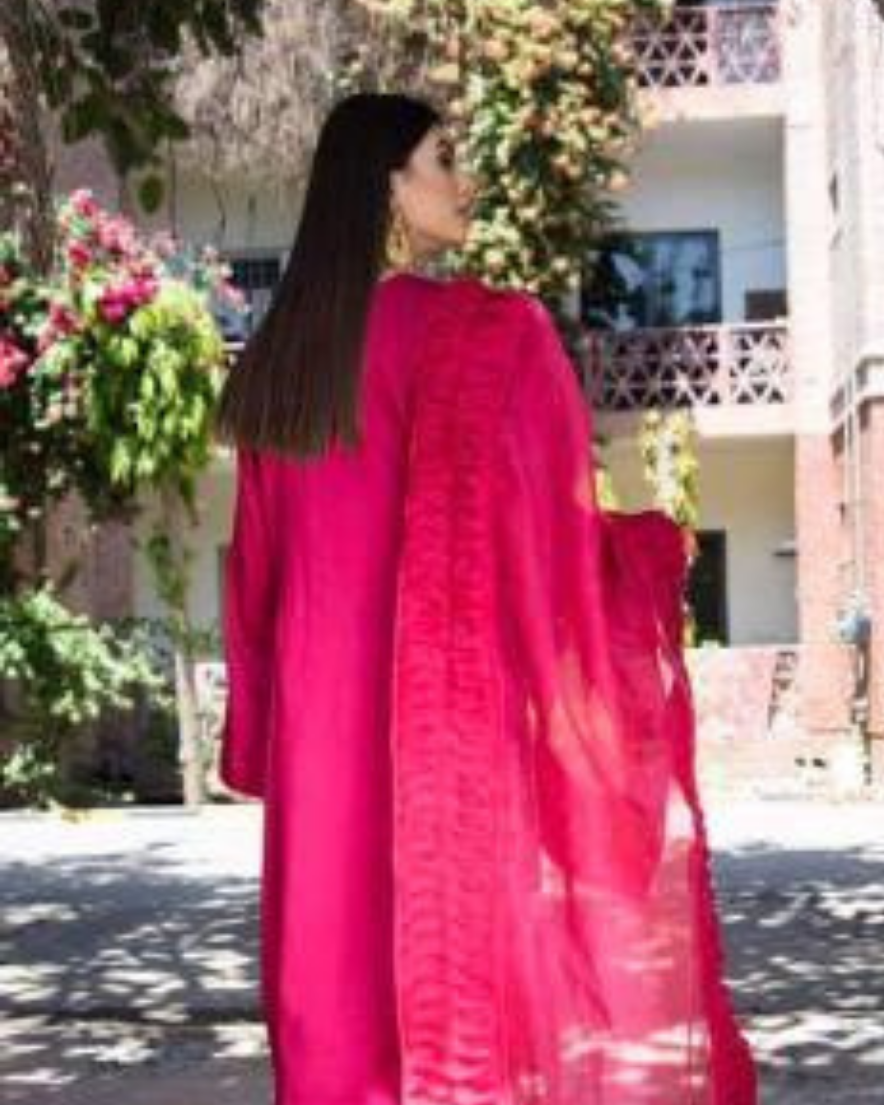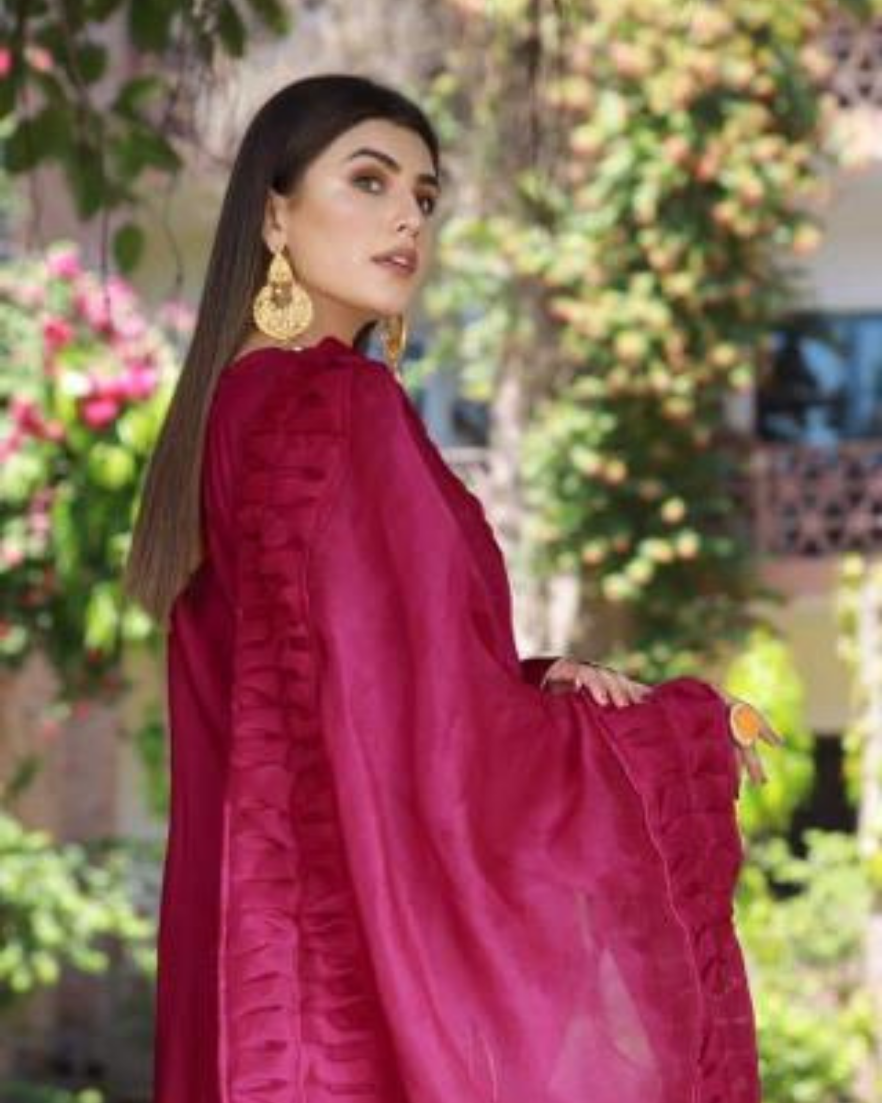 This stunning magenta long shirt is paired with straight trousers. The neckline is beautifully embellished with kora and dubki. The dupatta is a show stopper with a reverse ruffled border running around all four edges.