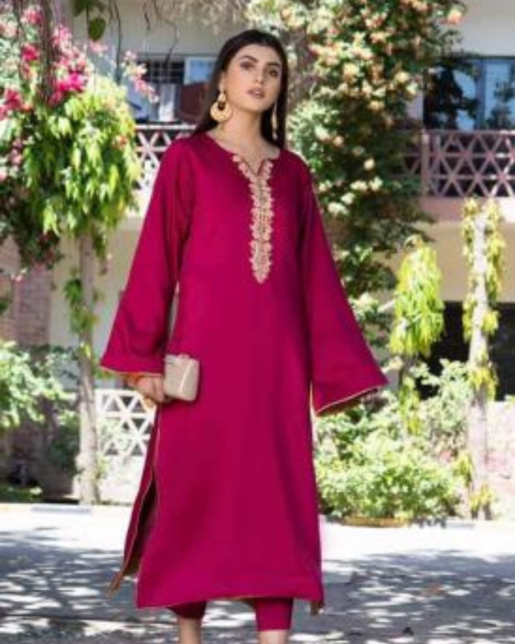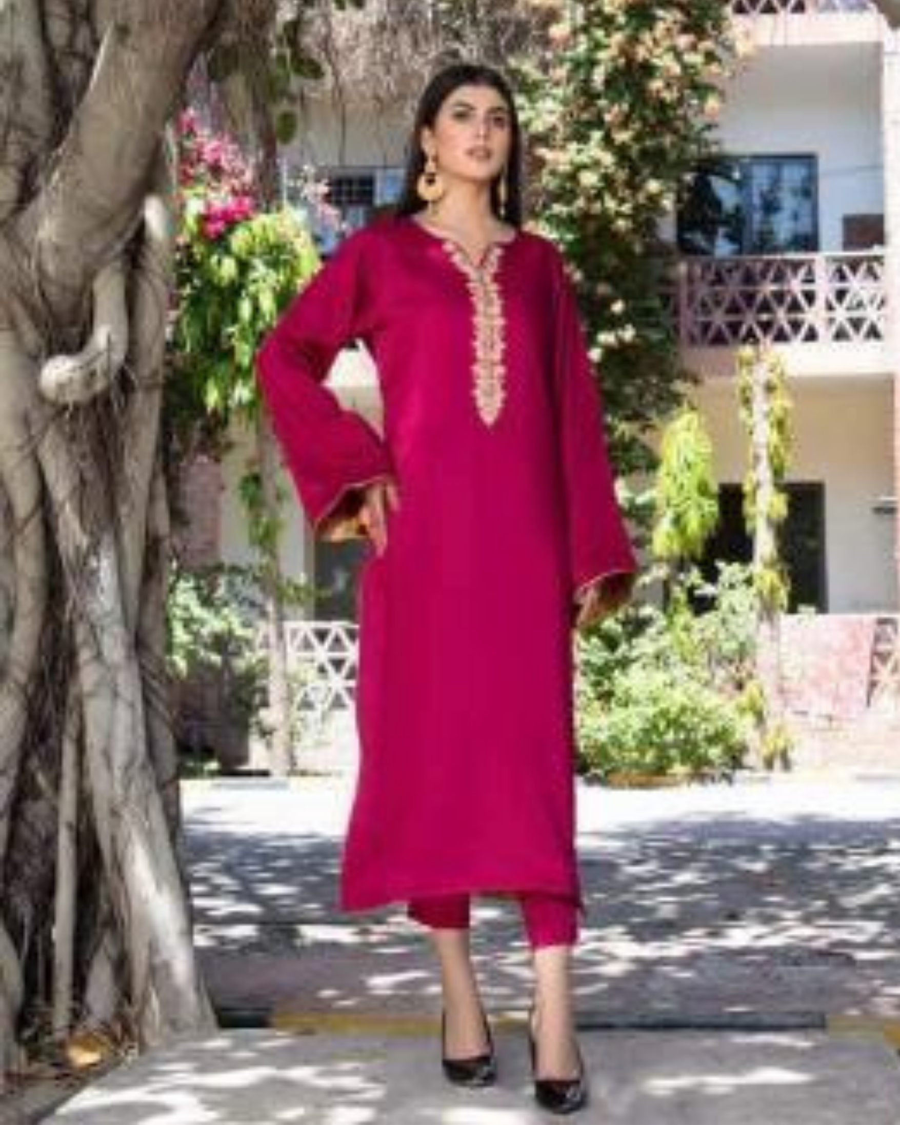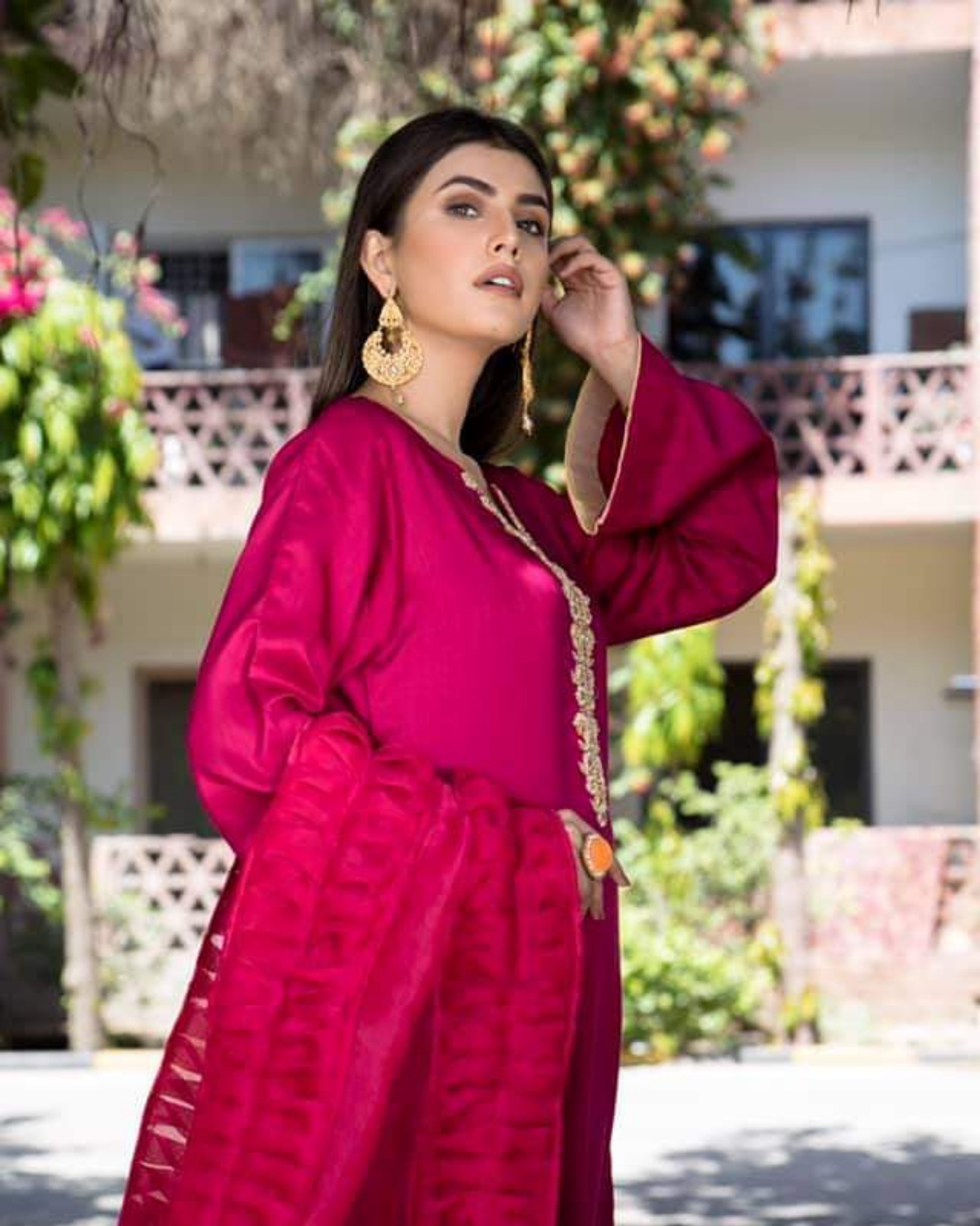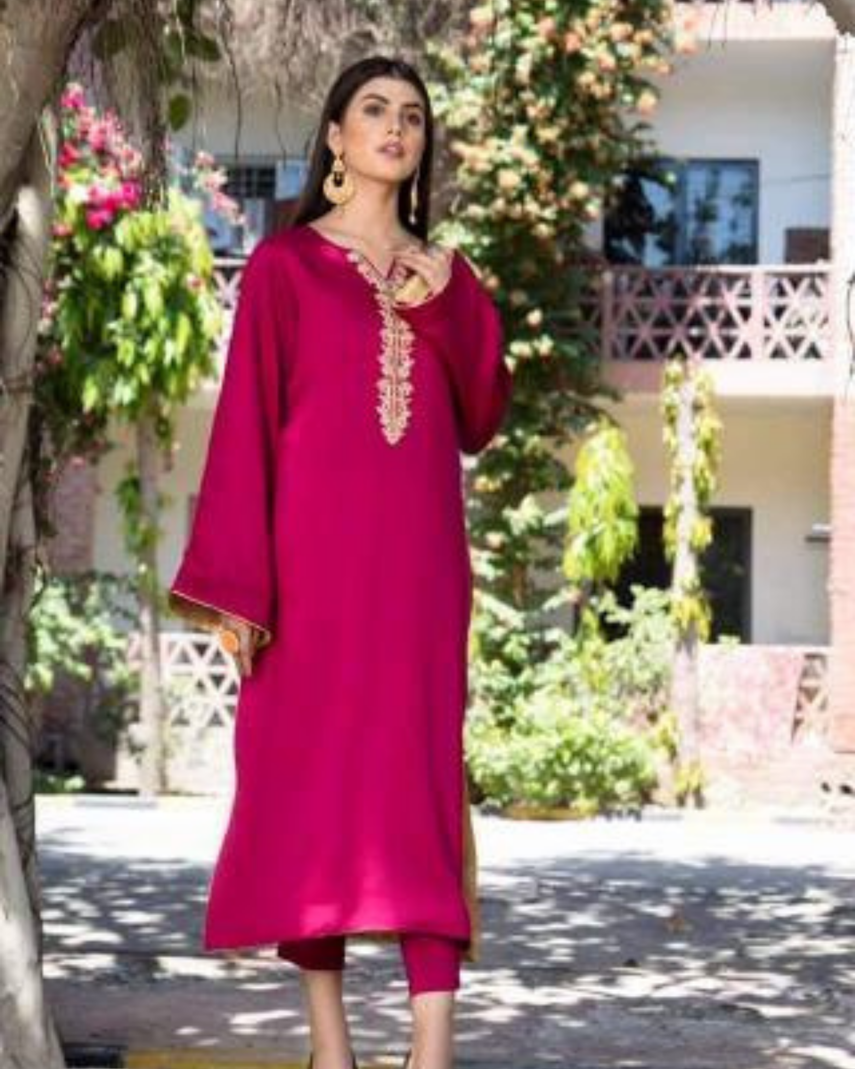 This stunning magenta long shirt is paired with straight trousers. The neckline is beautifully embellished with kora and dubki. The dupatta is a show stopper with a reverse ruffled border running around all four edges.