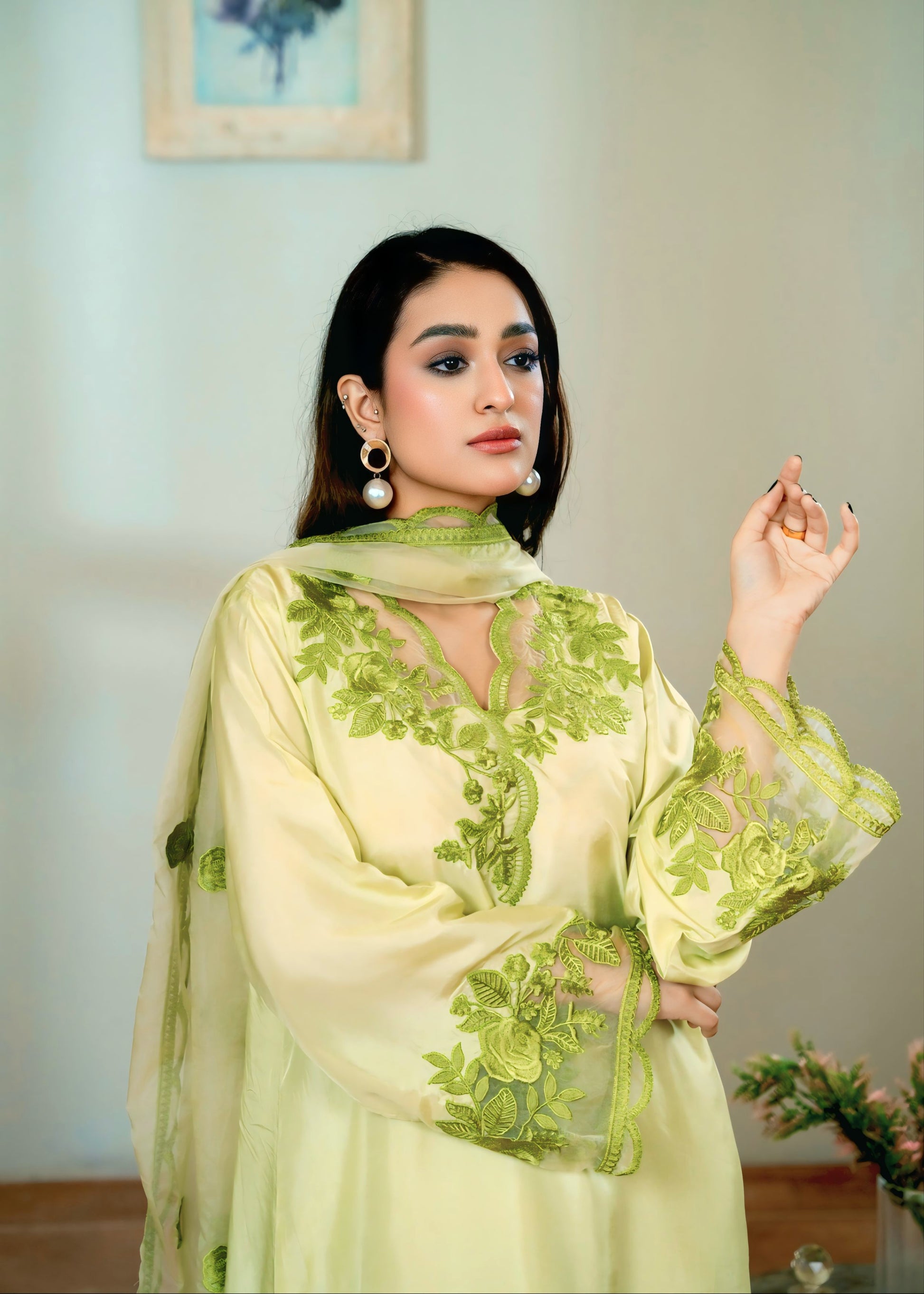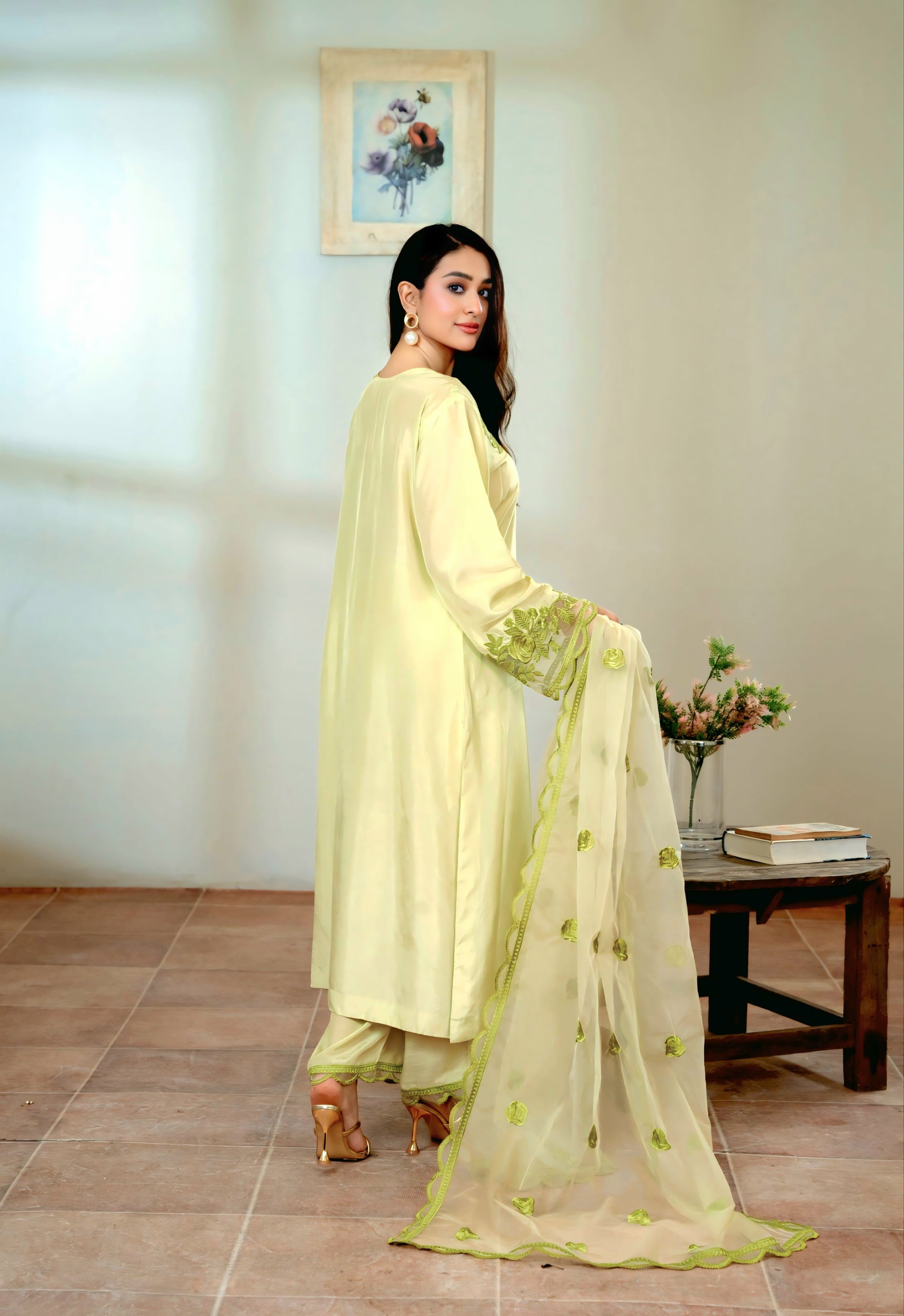 The lemon yellow, perfectly complemented by intricate neon embroidery that adds a modern twist to this traditional outfit. Crafted from the finest quality fabric, making it a show-stopping piece.