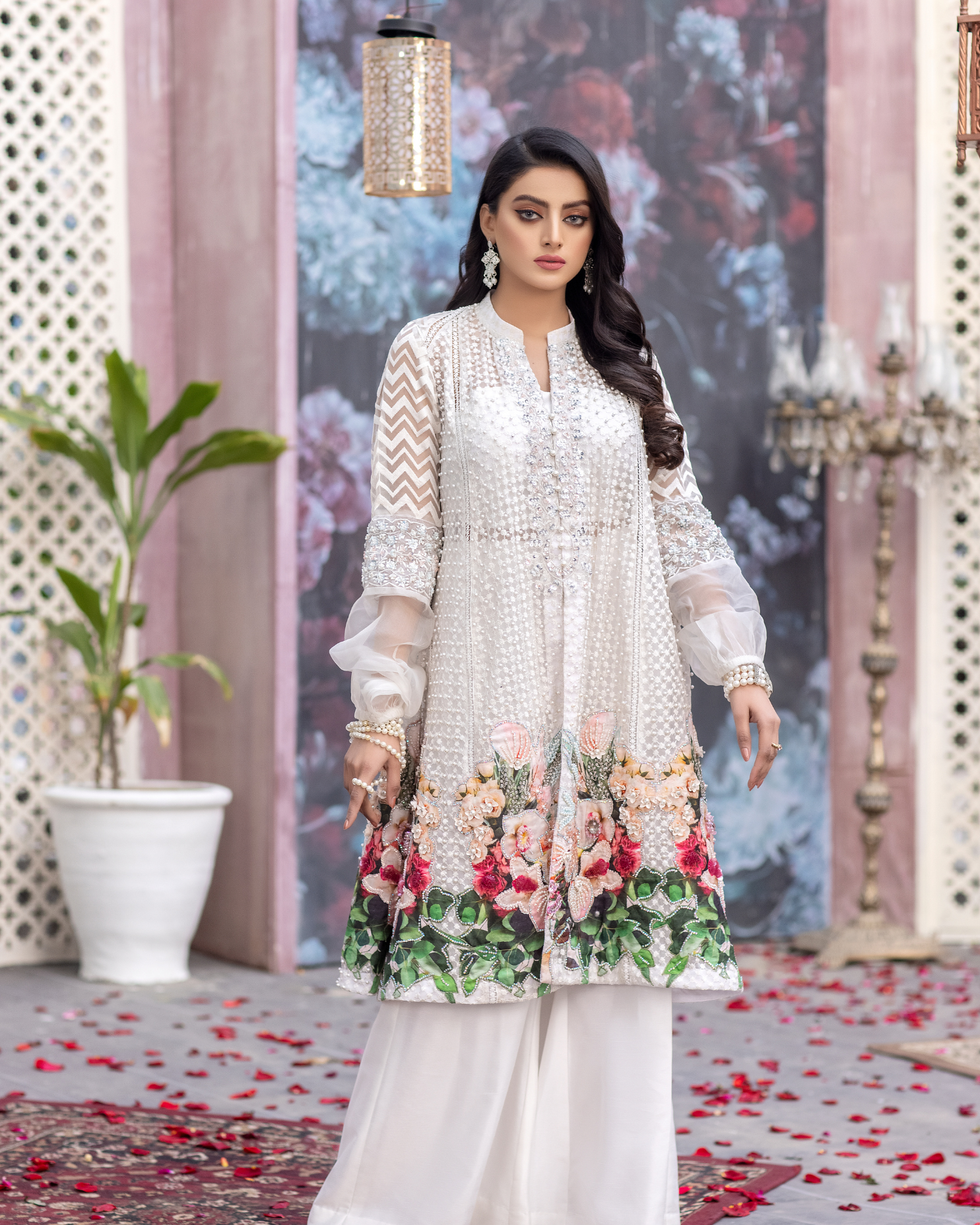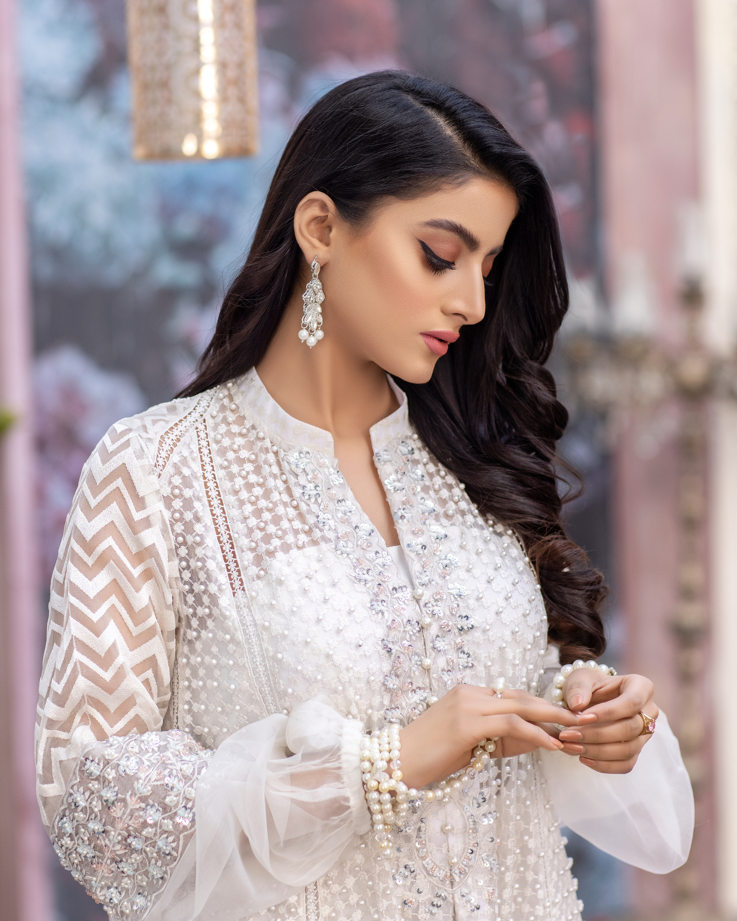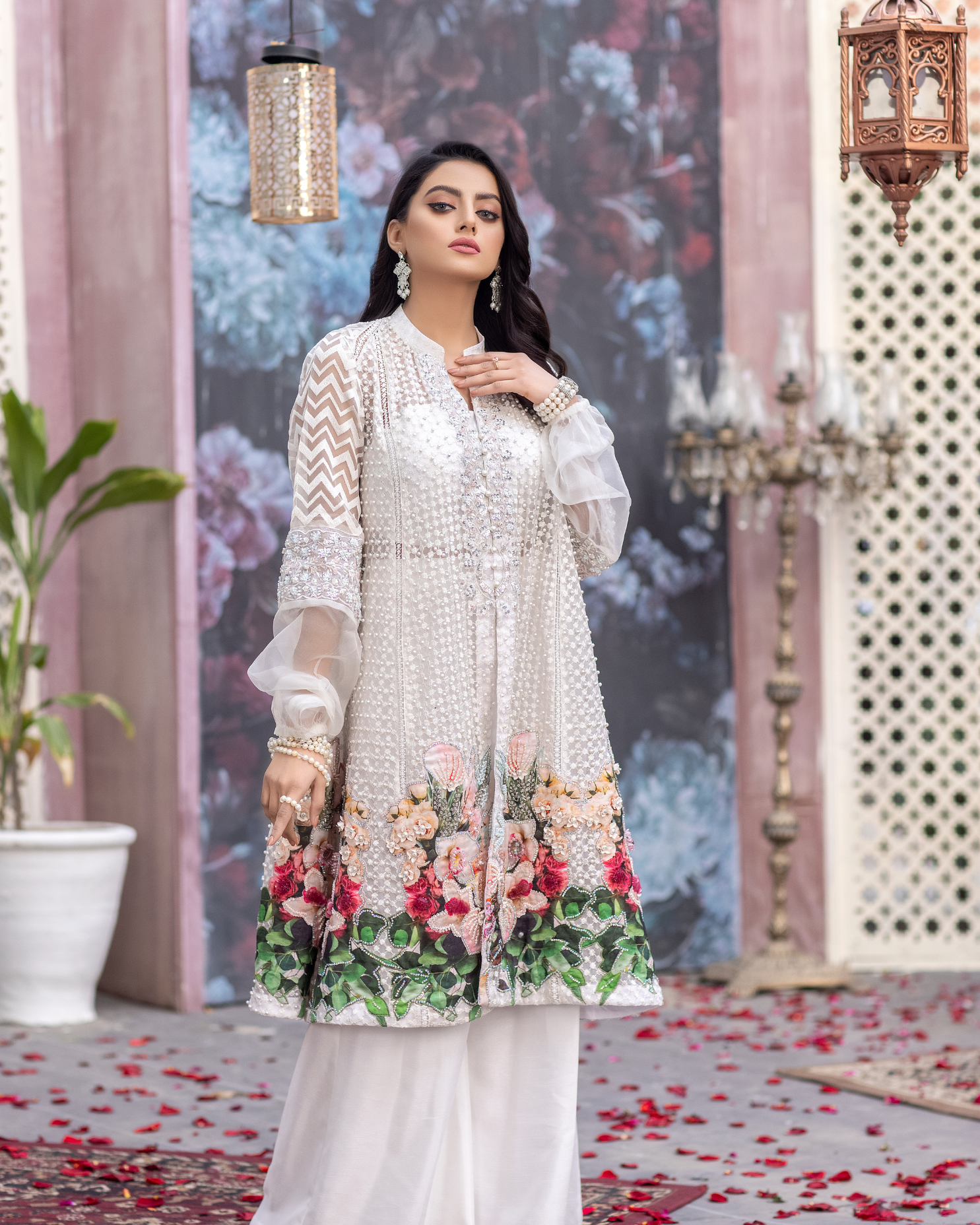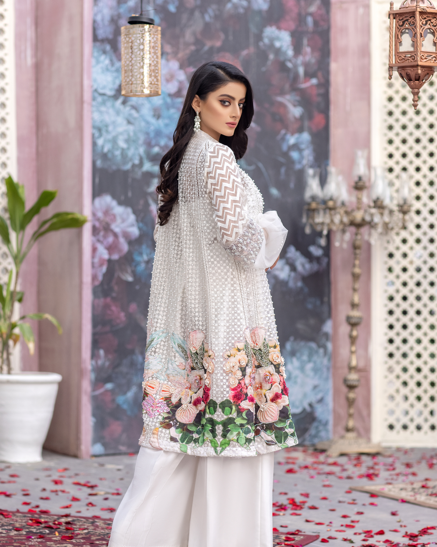 Presenting Pearl Snow a vision of pearly white royalty. This exquisite open gown-style Organza shirt is a masterpiece, hand-embellished with shimmering Swarovski stones, lustrous pearls, and sparkling diamondizes, creating a captivating aura of elegance. The delicate applique work gracefully adorns the Korean Silk inner and trousers, elevating the entire ensemble to new heights of sophistication. 🤍