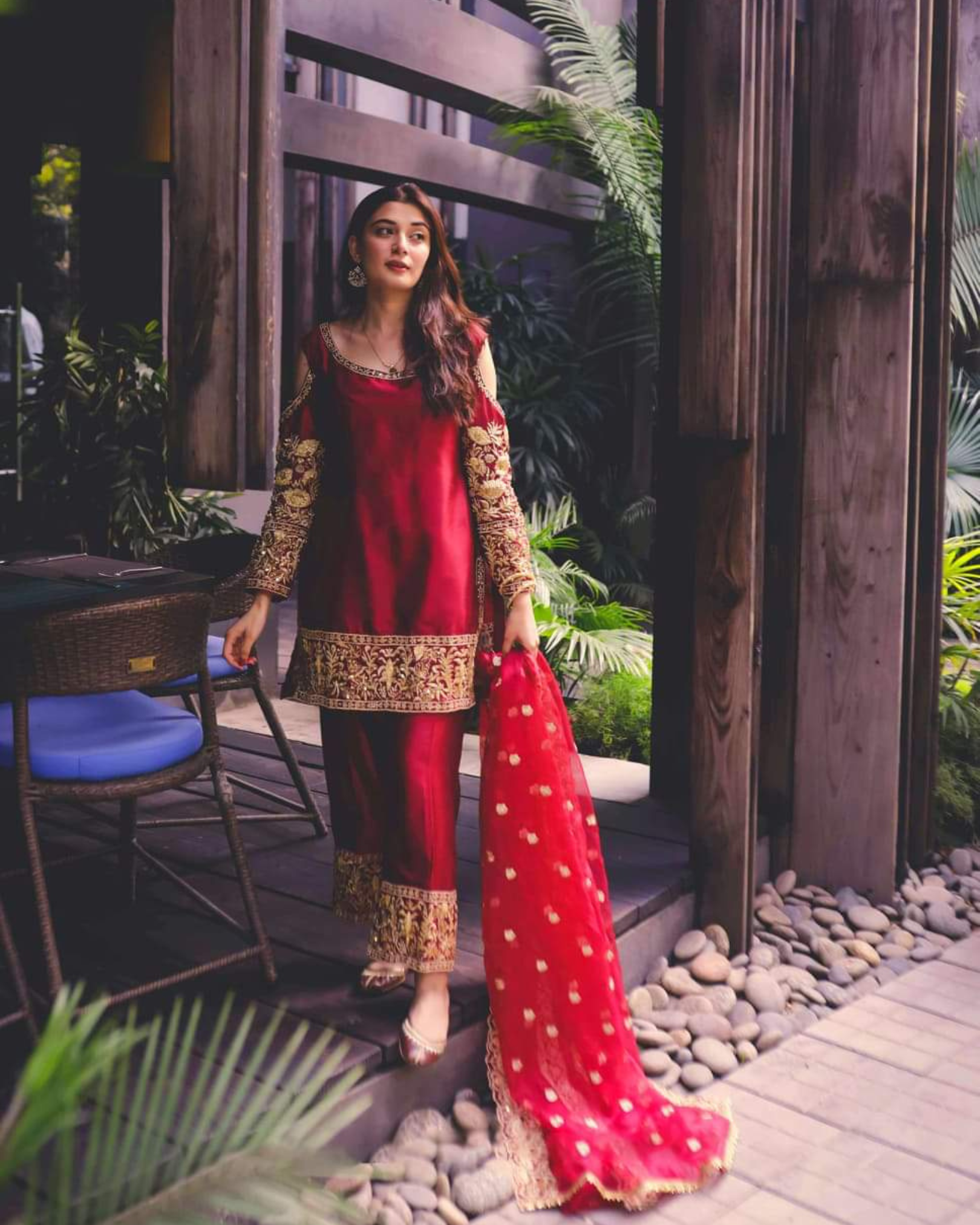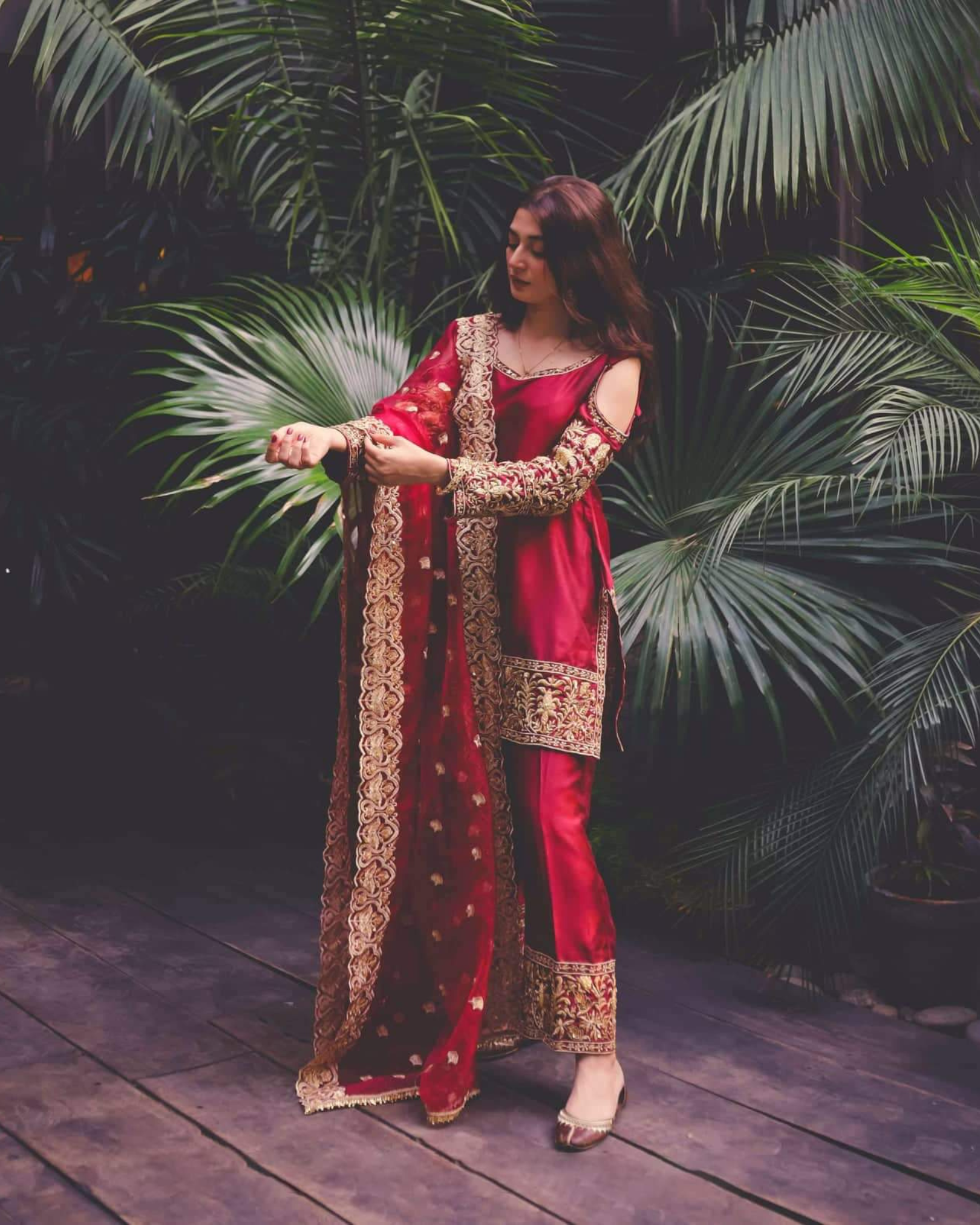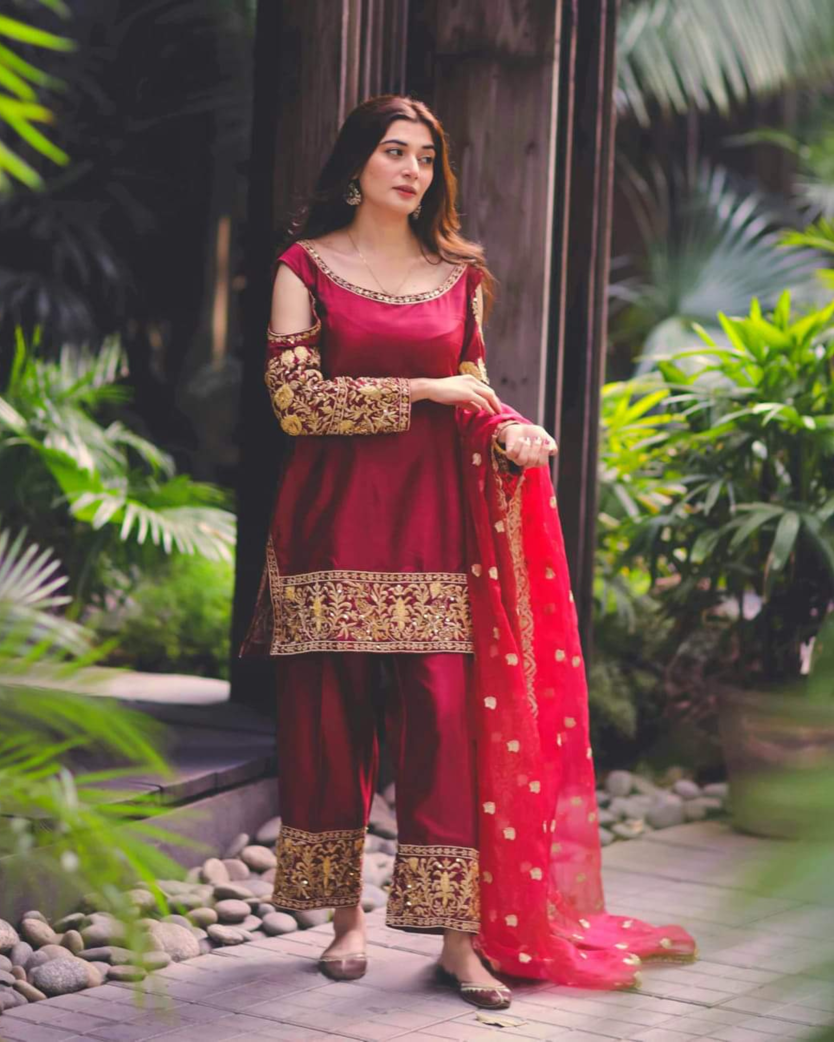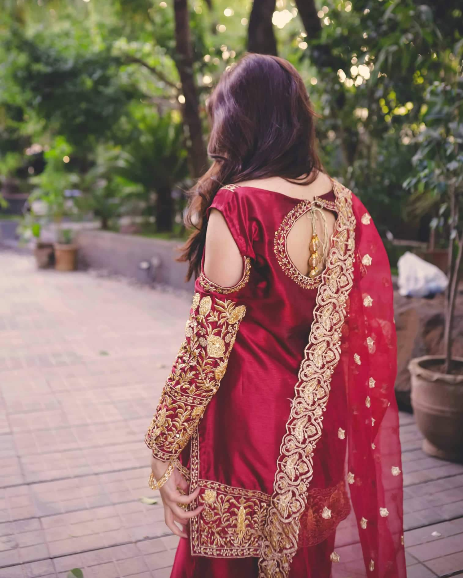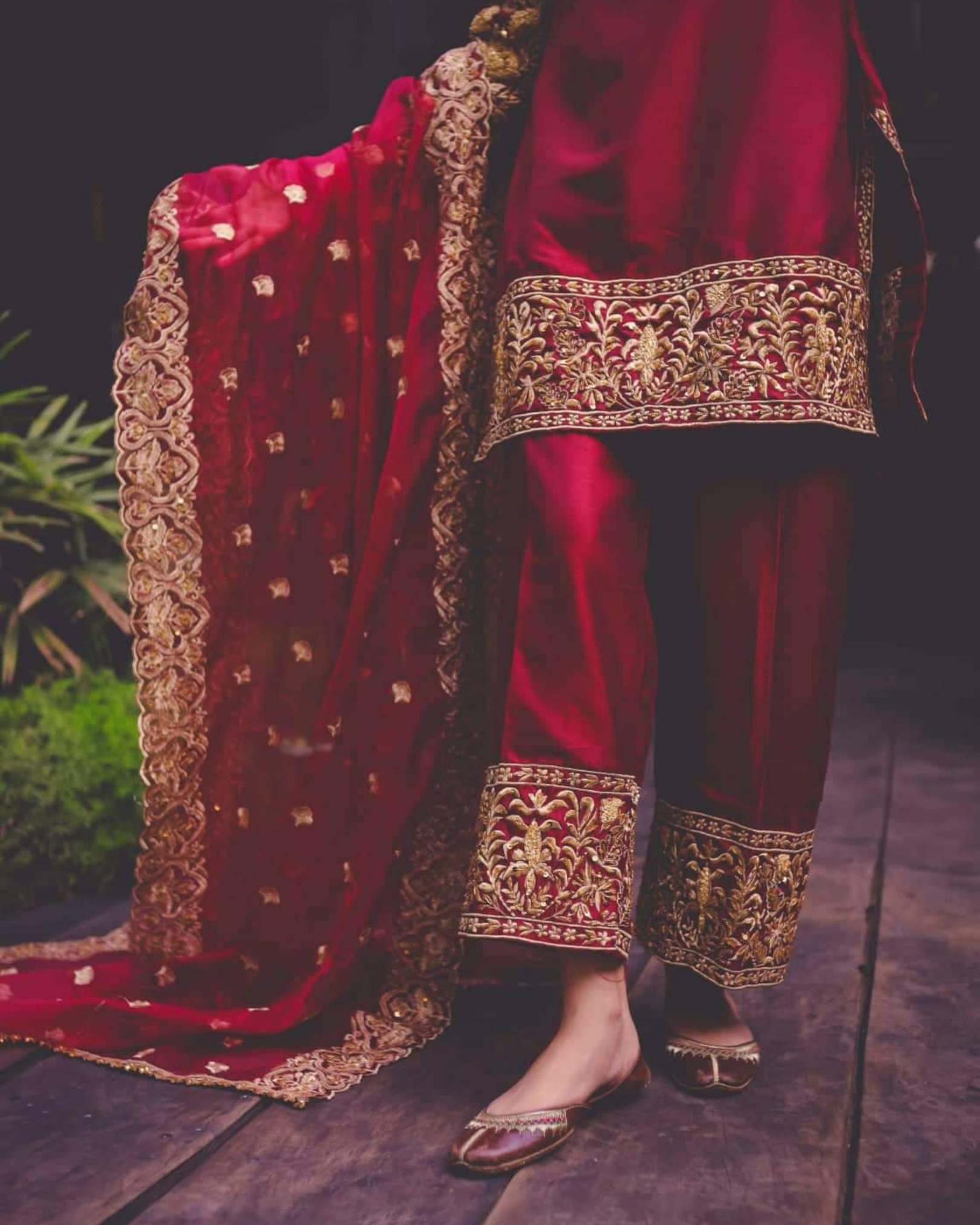 روغن گلاب a breathtaking creation where tradition meets modern elegance. The intricate Golden Tilla work adds an illustrious touch, while the extensive hand embroidery and delicate hand embellishments create a stunning contrast against the rich Red Raw Silk. This exquisite combination of craftsmanship and luxury highlights the golden detailing, making it the centerpiece of the design. A true testament to artistry, روغن گلاب redefines sophistication in every stitch.
